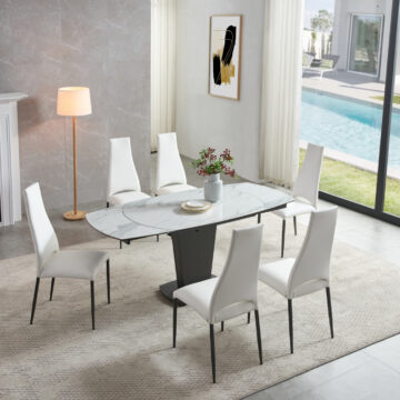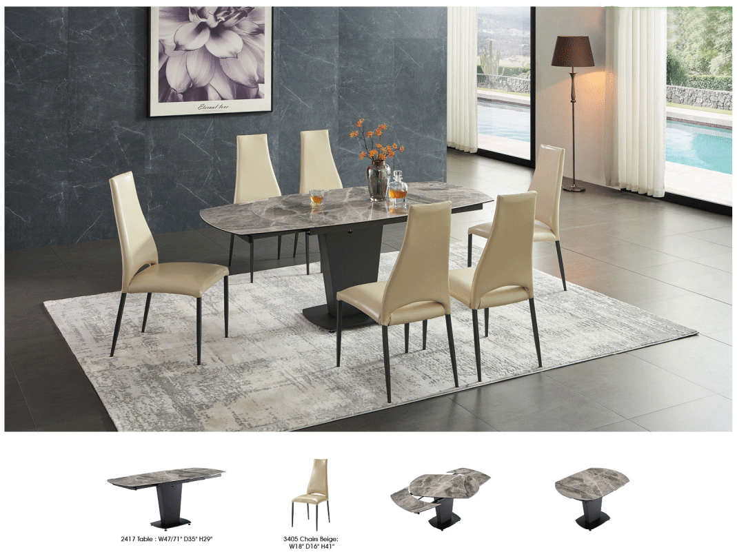The 2417 Marble Table Grey with 3405 Chairs Cream from the Extravaganza Collection by ESF invites a sense of modern luxury into your home. This exquisite set, a centerpiece of our Dining Room Furniture Kitchen Tables and Chairs Sets, features a tabletop of 5mm Chinese grey marble ceramic, offering a durable yet sophisticated surface for your culinary gatherings. The table is anchored by a sturdy grey sanded powder-coated metal base, mirroring the industrial-chic aesthetic of the chairs’ frames. These elegant seats are upholstered in premium cream PU eco-leather (color# 2202-40), providing a soft, supple texture that complements the cool marble. Every meal becomes a curated experience as the balanced volumes and refined materials transform your dining area into a gallery of contemporary style. Whether hosting a formal dinner or enjoying a quiet breakfast, this versatile ensemble reflects a commitment to artistic flair and enduring quality, harmonizing perfectly with the most refined interior elements.