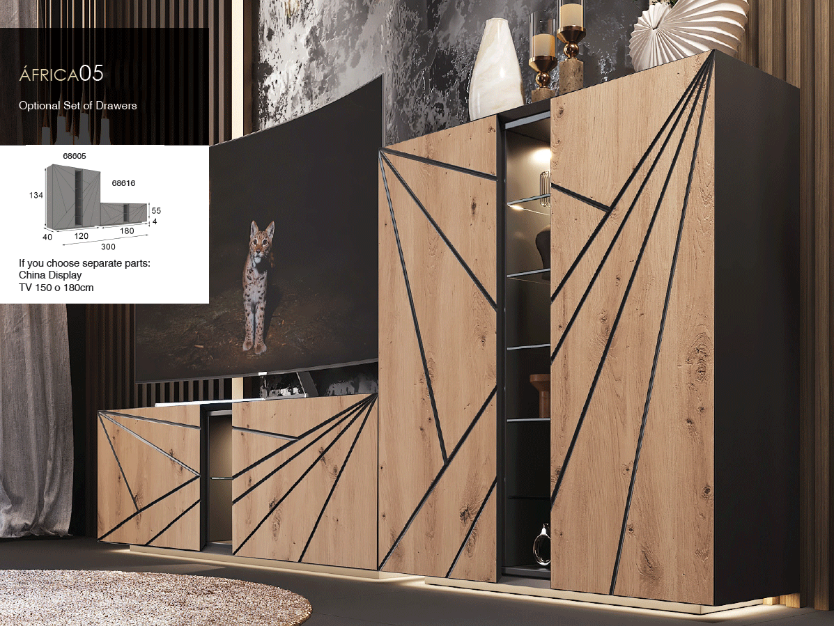 Constructed from premium wood-based panels and high-quality MDF, this unit is built to provide lasting durability alongside its refined appearance. The use of special order materials ensures that each Africa 05 is a testament to superior craftsmanship and high-end design. Its sleek lines and thoughtful structure provide the perfect backdrop for your television and decorative accents, creating an organized yet artistic atmosphere in your living room.