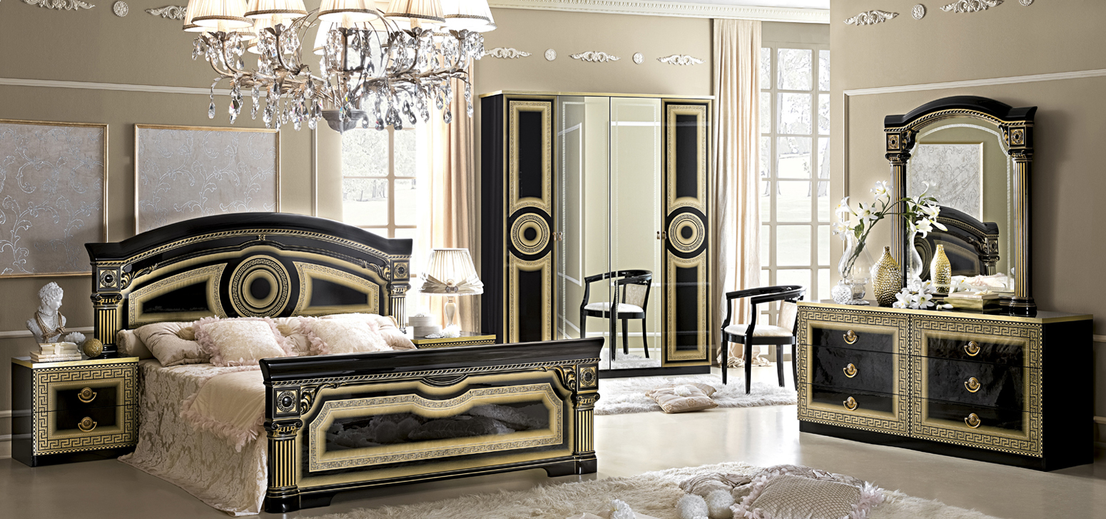 Ideal for luxury or traditional interiors, the Aida Bed showcases sturdy construction alongside delicate decorative details. Key features include its ornate European-inspired styling, decorative panels, and a high-contrast palette that emphasizes its stately form. Elevate your home with this exceptional piece of Italian craftsmanship, designed to offer both a visually striking profile and a sanctuary of timeless style.
