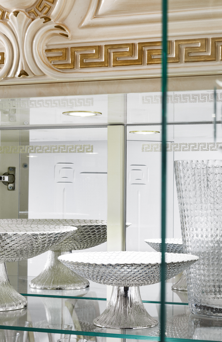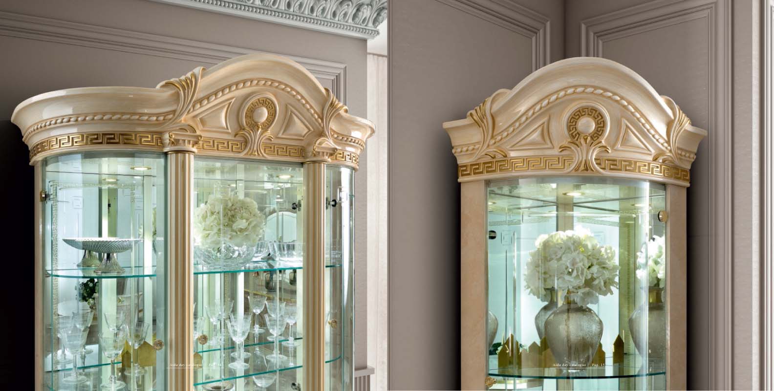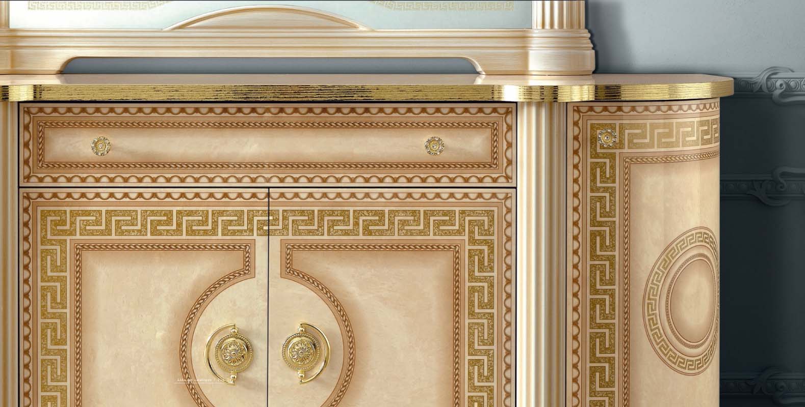 Bring a touch of Italian grandeur to your home with the Aida Dining collection, a masterpiece from Camelgroup Italy by ESF. This luxurious set, found within our Classic Dining Room Sets, captures the essence of European-inspired design through its warm, light tones and opulent gold detailing. At the heart of this collection is a majestic round dining table, perfectly complemented by chairs upholstered in exquisite Fabric Scarlet 08 for a refined sitting experience. Crafted from premium wood veneer, glass, and MDF, the ensemble includes a matching display cabinet and a sideboard with a mirror, blending artistic beauty with functional storage. Each piece reflects a commitment to timeless craftsmanship, transforming any formal space into a sophisticated sanctuary for elegant gatherings. Please note that all china cabinets require professional assembly to ensure their structural integrity and lasting beauty. Elevate your interior with this graceful balance of tradition and luxury.