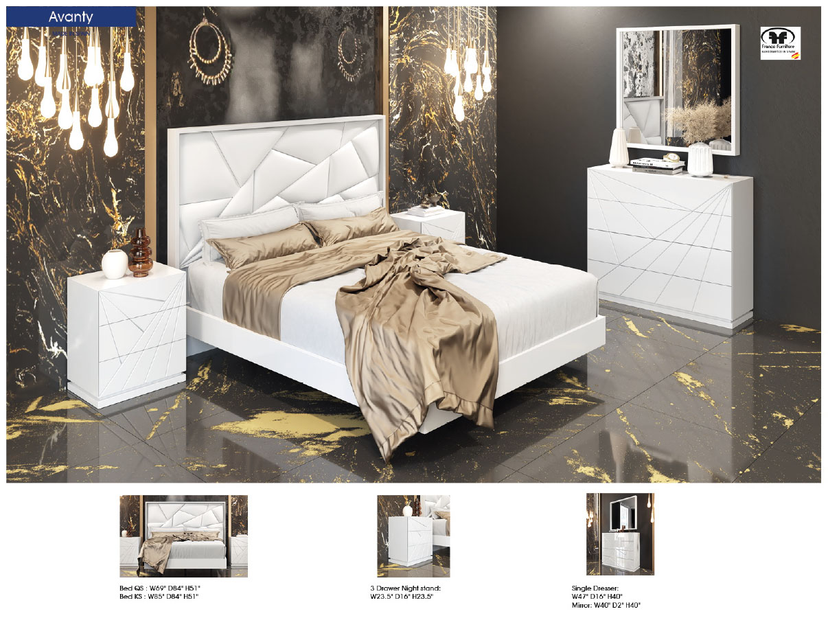 Elevate your home with the Avanty Bedroom SOLD AS COMPLETE BEDGROUP ONLY, a masterpiece of modern design from the Franco Spain by ESF collection. This exquisite set, part of our premium Bedroom Furniture and Modern Bedrooms QS and KS selection, is meticulously crafted in Spain to bring a sense of purity and tranquility to your personal sanctuary. Featuring a crisp 120 matt white finish, the collection transforms any room into a serene retreat characterized by clean lines and sophisticated minimalism.
