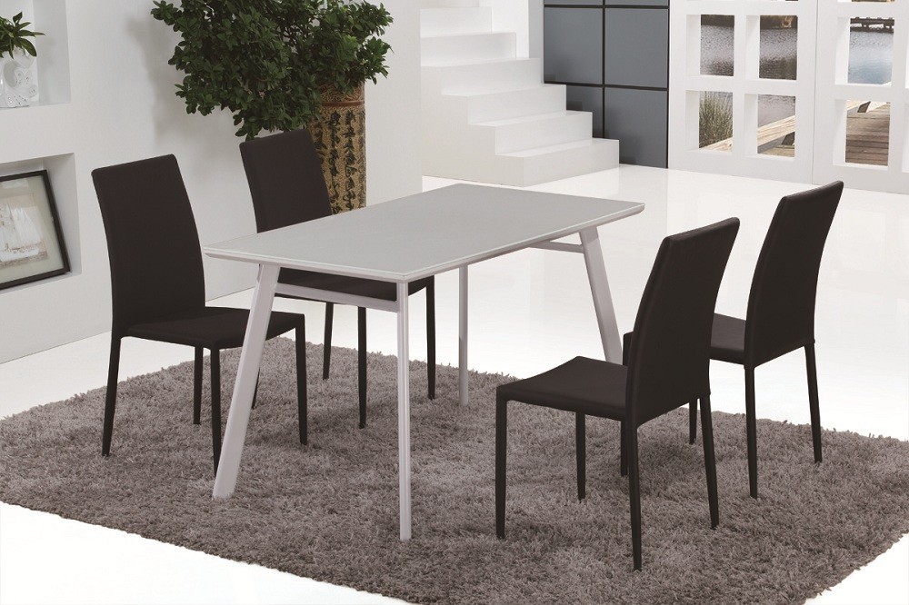 Rectangular dining table with white lacquer finish covered by a glass top, and white chrome legs. This dining table is an easy fit to any dining room/kitchen environment. Perfect fit with the DC13 J&M Dining Chairs, this Dining Set offers a contemporary approach in design.