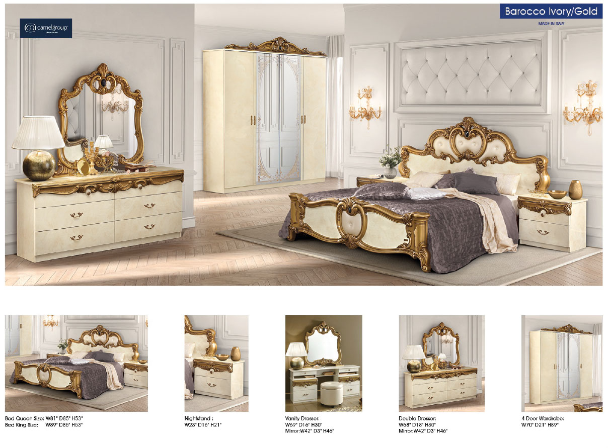 The Barocco Ivory w/Gold Bedroom set by Camelgroup Italy for ESF is a regal Italian-made ensemble featuring a tufted headboard and intricate gold-accented carvings. Crafted from premium wood veneer and MDF, this classic collection brings a palace-like atmosphere to upscale bedrooms. Its soft cream finish and durable metallic details offer a perfect blend of traditional craftsmanship and bright, sophisticated design.