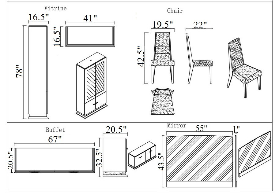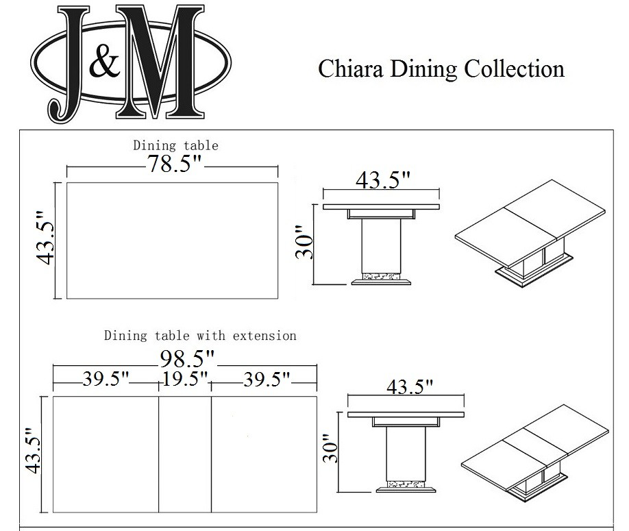 The table can be extended from 78.5″ to 98.5″ to accomodate plenty of seating. The buffet conveniently provides plenty of storage and a drawer for utensiles. The vitrin features plenty of storage with glass doors to showcase accent items, or fine china. A beautiful collection fit for royalty.
