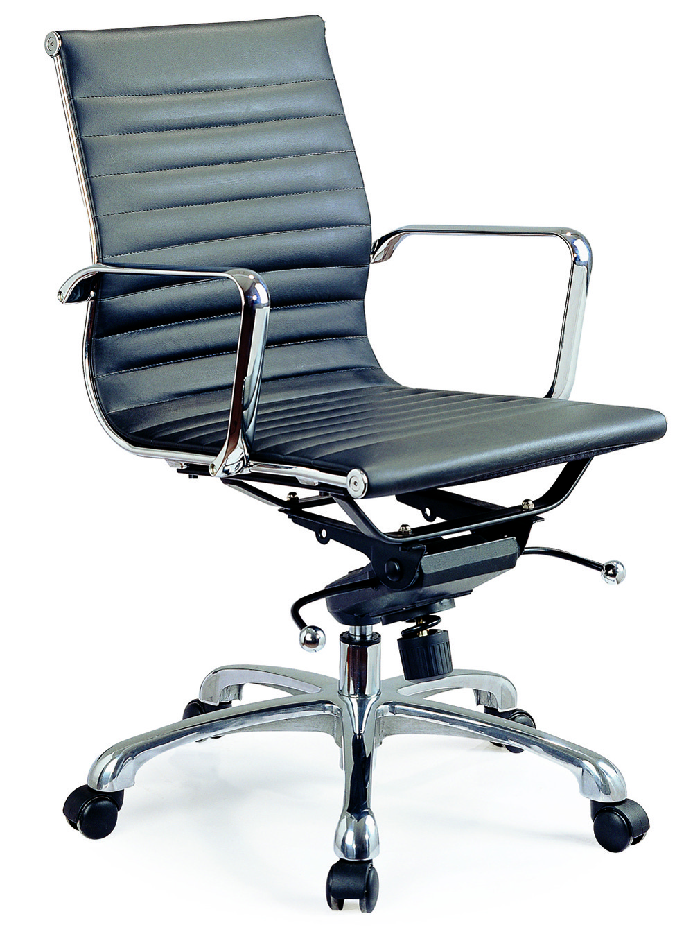 This modern office chair features a leatherette seat and back in your choice of color. Its leather is