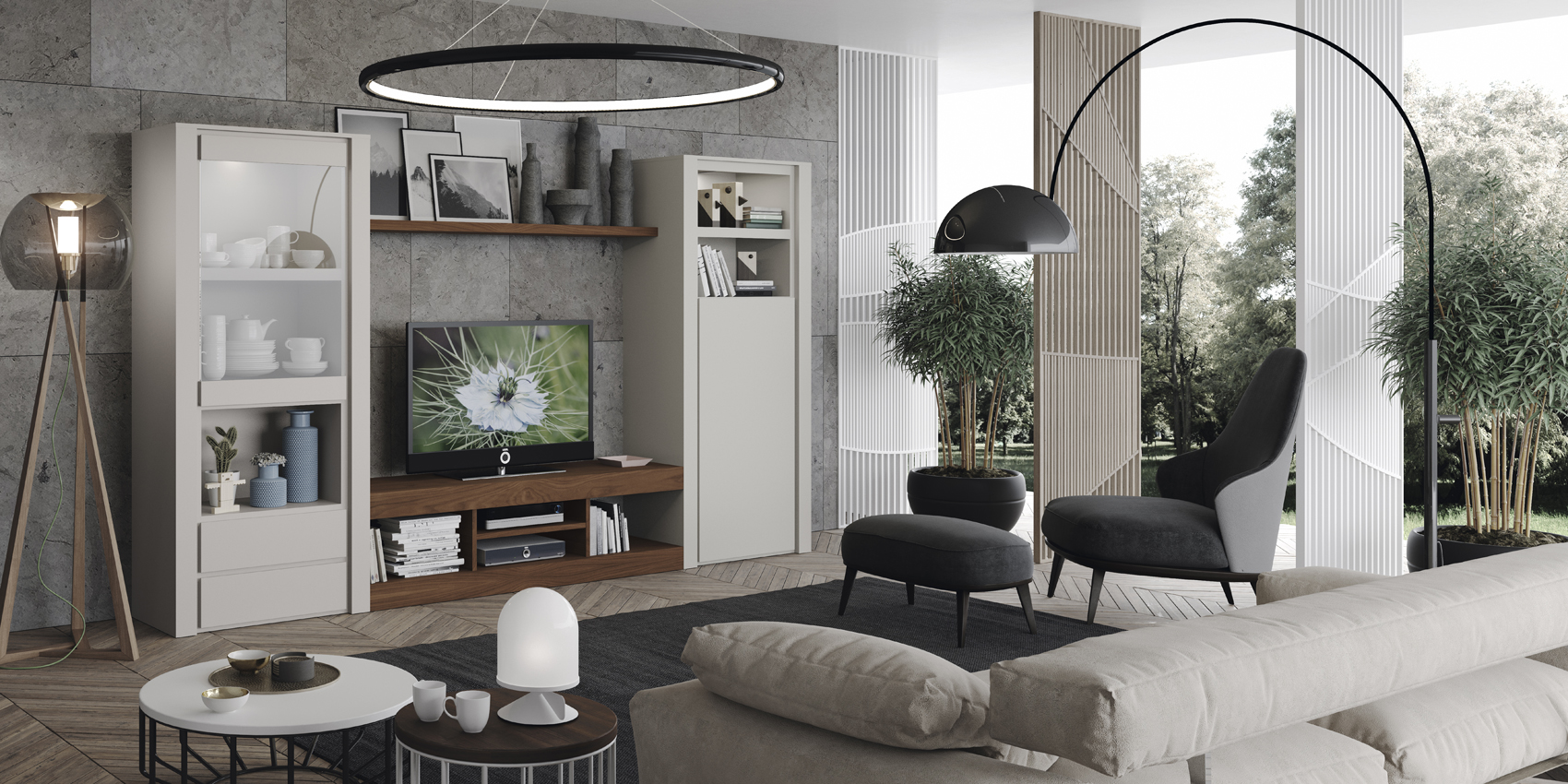 The Composition H2 is an exquisite centerpiece from our Garcia Laurel & Hardy Wall Unites, meticulously crafted by the renowned Garcia Sabate in Spain. This sophisticated wall unit showcases the perfect marriage of modern European design and functional artistry, featuring a stunning contrast between a Blanco mate finish and the rich, natural warmth of Nogal Americano. Designed to elevate any contemporary living space, the unit stands 72 inches high and spans a generous 125.5 inches, mirroring the impressive scale seen in the product imagery.