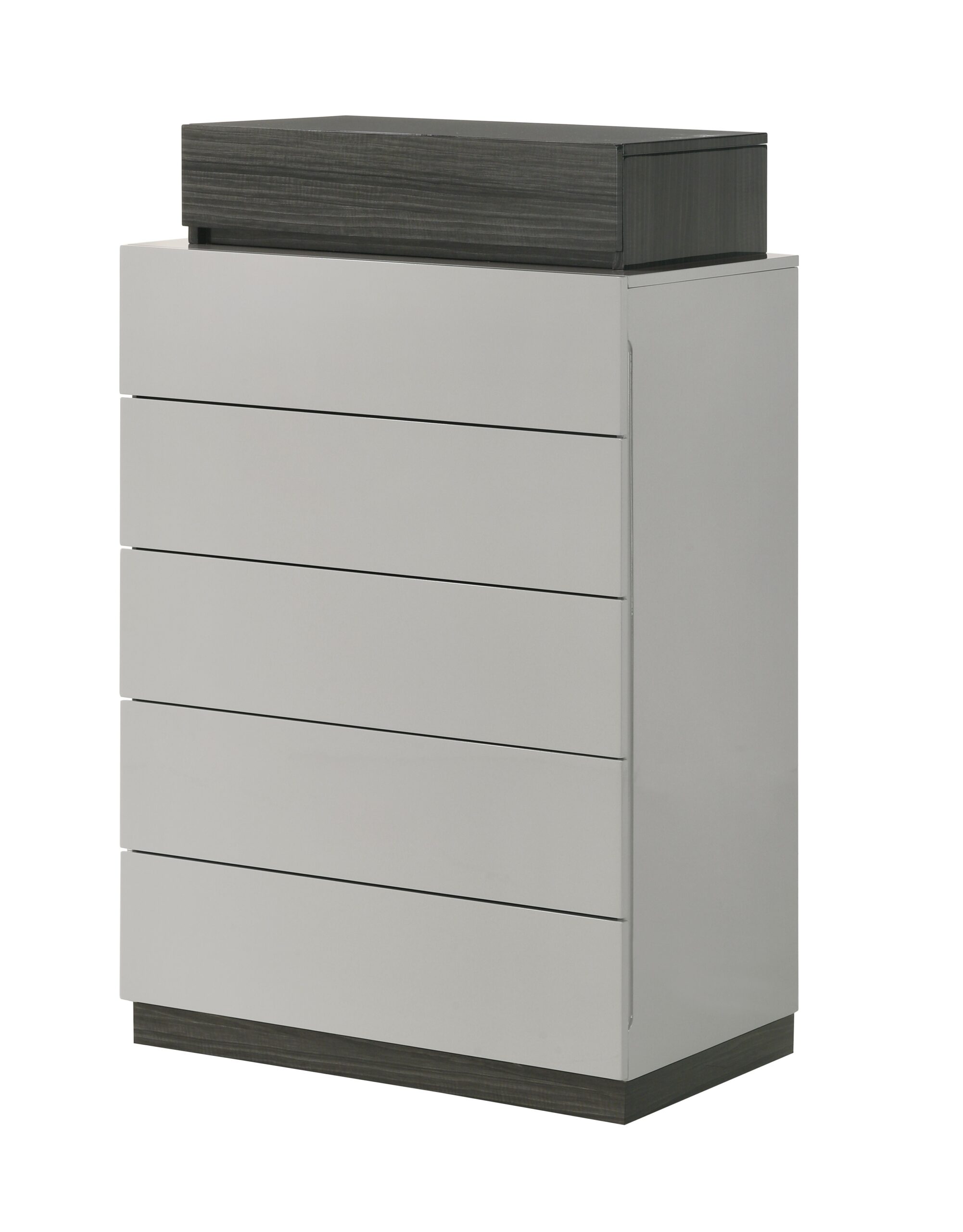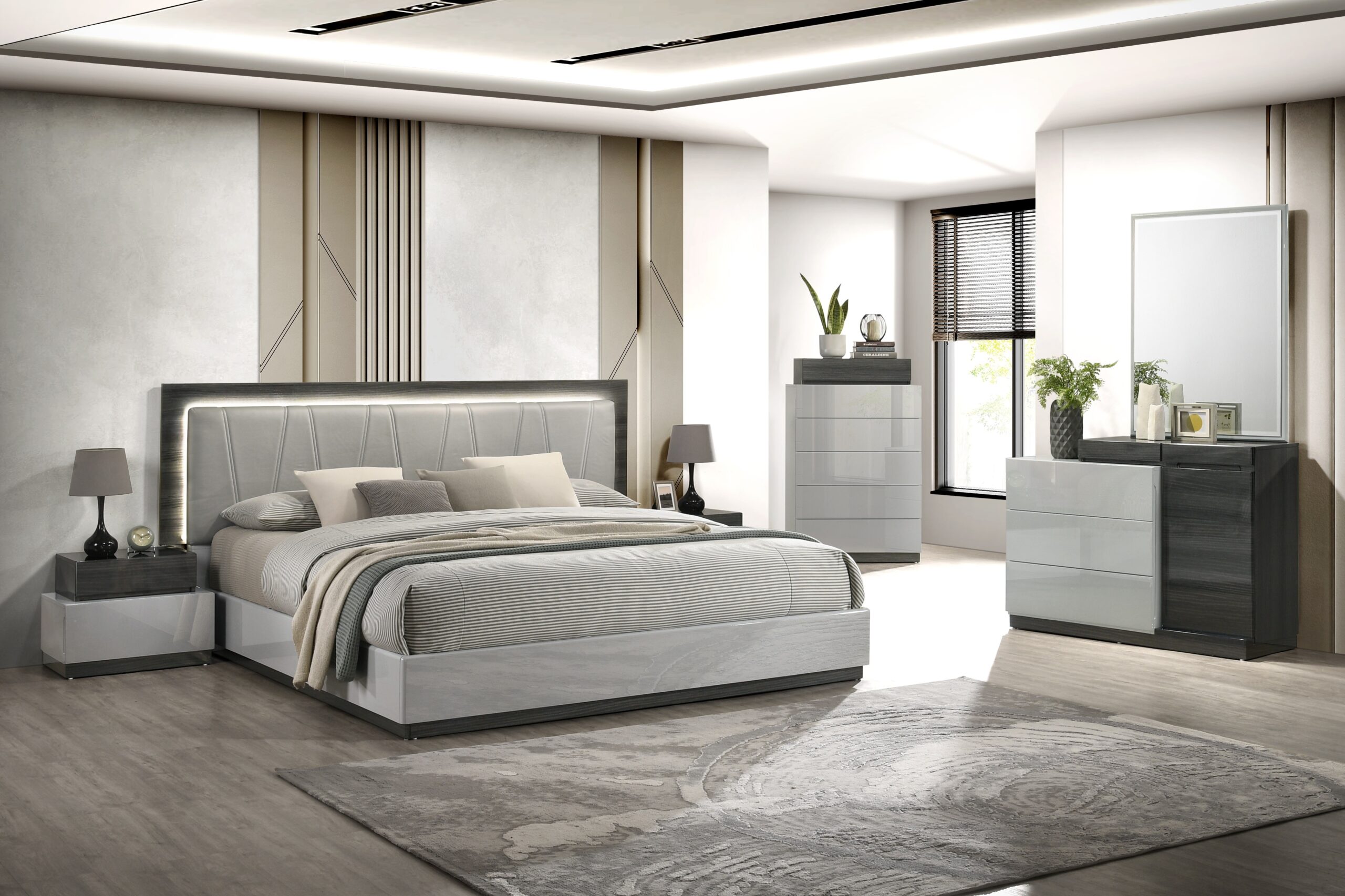 Introducing the Cube Bedroom Set from J&M Furniture. This elegant set combines modern sophistication with functional design. Featuring a stunning light grey high-gloss finish contrasted by rich high gloss dark zebra grey, this set creates a sleek, contemporary ambiance for any bedroom. The bed’s headboard is upholstered in luxurious light grey eco-leather for added comfort, while the built-in LED light provides a soft, elegant glow to enhance the cozy atmosphere.