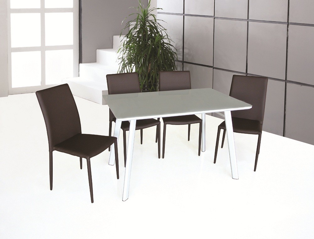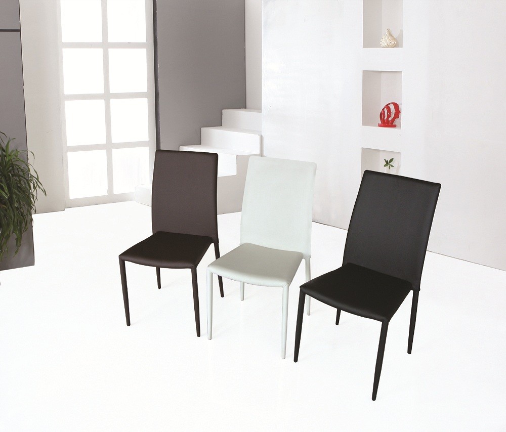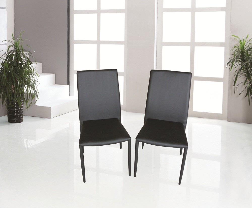 The modern dining leather chairs will accent any environment. Available in Black, White, and Chocolate, these leather covered chairs will give you infinite matching options.