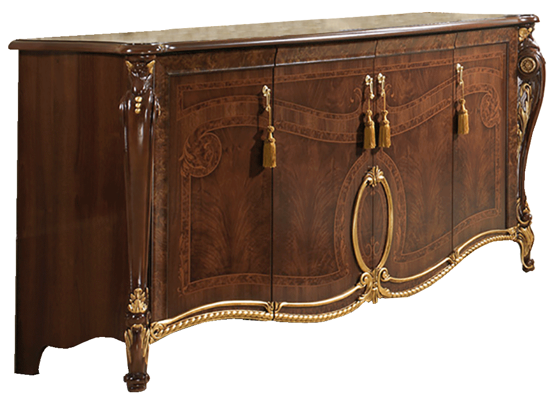 Enhance your home with the Donatello 4 Door Buffet, a masterpiece of Italian design from the Arredoclassic Italy collection. This sophisticated buffet, perfect for any walnut-themed dining room, serves as both a functional storage solution and a stunning focal point. Expertly crafted from high-quality wood veneer and MDF, it embodies the durability and refined aesthetics expected from premium Dining Room Furniture. The Donatello 4 Door Buffet offers a seamless blend of classic style and modern utility, providing ample space for your fine china and dining essentials within its elegant silhouette. Whether you are hosting an intimate dinner party or organizing your daily living space, this piece brings a touch of timeless luxury and artistic flair to your interior. Its rich walnut tones and meticulous construction make it a standout addition to China Cabinets and Buffets, ensuring that your dining area remains a gallery of taste and refinement for years to come.