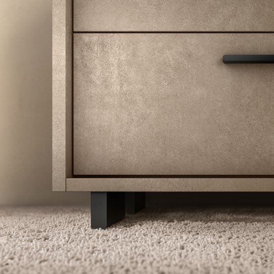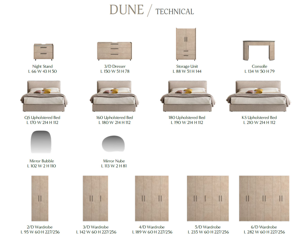 The Dune Bedroom collection, a centerpiece of our Modern Bedrooms QS and KS, masterfully blends contemporary elegance with a warm, inviting atmosphere. This Italian-made set is meticulously crafted from premium wood veneer and MDF, ensuring a lasting legacy of quality in your home. The design is defined by a sophisticated beige tone, perfectly accented by sleek black handles that provide a touch of minimalist charm to the overall aesthetic.