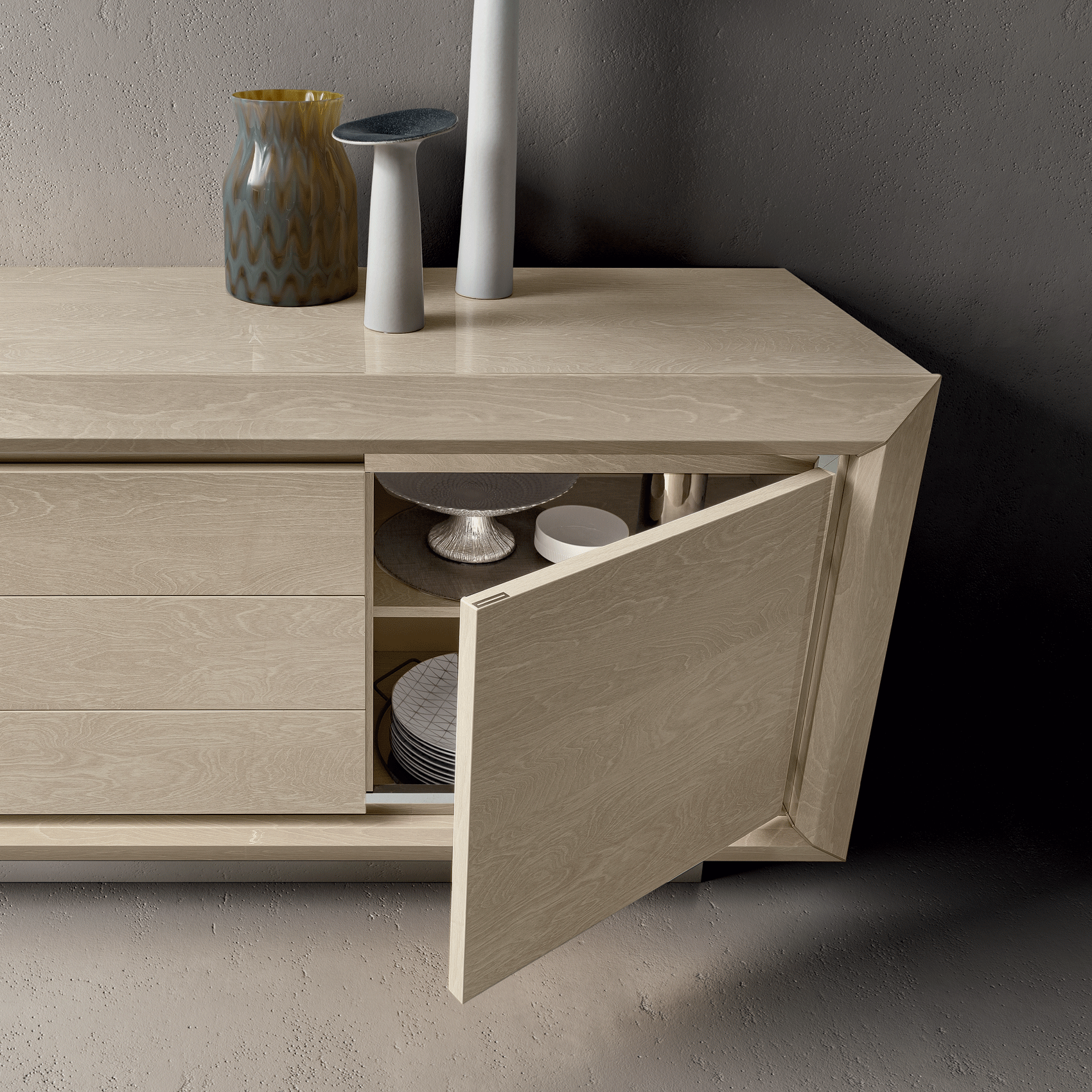 The Elite Day Sabbia Entertainment Additional items set is a masterpiece of Italian craftsmanship from Camelgroup Italy by ESF, designed to transform your living area into a bastion of modern luxury. This comprehensive arrangement features a sleek TV cabinet, two tall glass display cabinets for your most treasured collectibles, and a striking wall panel. The refined Betulla Sabbia Beige finish radiates a soft, upscale glow, harmonizing perfectly with the integrated LED lighting that provides a sophisticated ambient atmosphere.