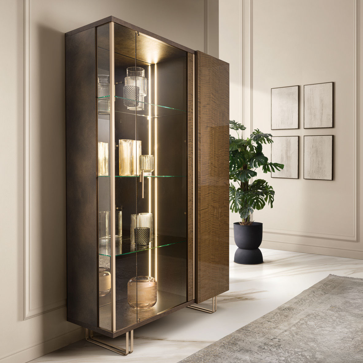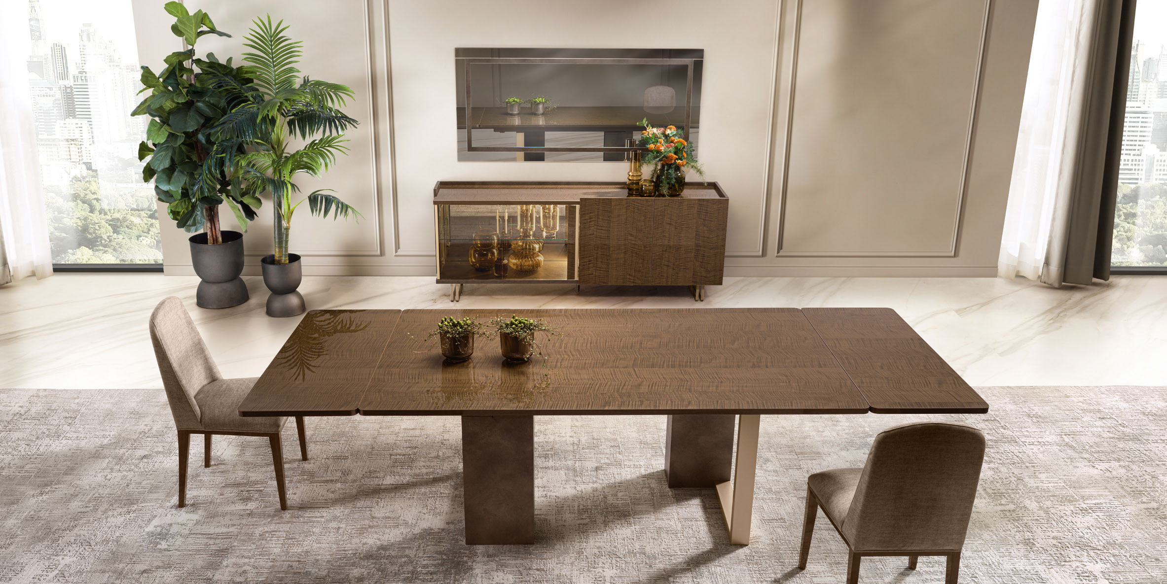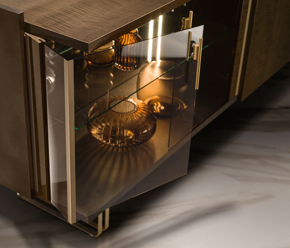 The Fiamma Dining room collection, part of the exquisite Arredoclassic Italy line, epitomizes the union of modern luxury and refined elegance. This sophisticated set, categorized under Modern Dining Room Sets, features a striking high-gloss sycamore walnut finish that captures the light and elevates the ambiance of any home. Matte bronze side panels and champagne satin-gold profiles provide a distinguished contrast, highlighting the architectural volumes of each piece. Meticulously crafted from solid wood, wood veneer, and wood-based panels, this collection offers both durability and a high-end aesthetic. Whether you are hosting a formal gala or an intimate family dinner, the Fiamma collection transforms your space into a sanctuary of style. Its modular design and customizable options allow for a tailor-made interior that reflects your unique taste. Experience the pinnacle of Italian craftsmanship with this versatile furnishing system, designed to bring a touch of upscale charm to your daily life.