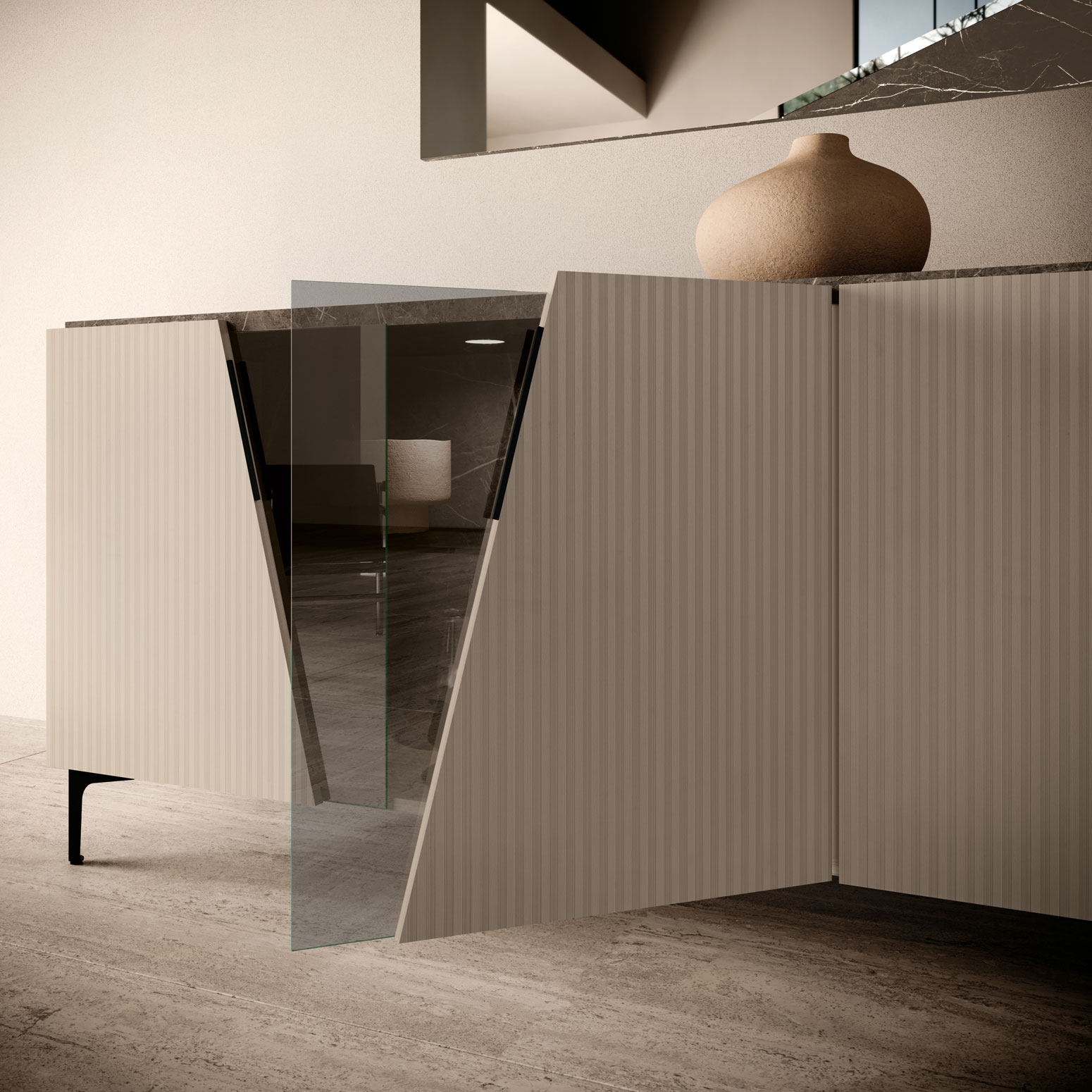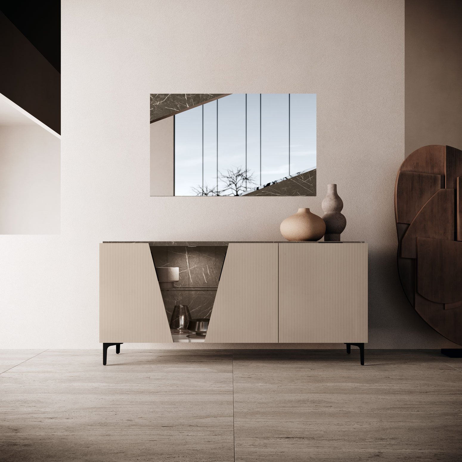 Elevate your home with the Fidia Buffet w/ Mirror, a masterpiece of Italian design that perfectly captures the essence of modern luxury within the Dining Room Furniture > China Cabinets and Buffets category. This striking set, part of the Camelgroup Italy collection by ESF, is meticulously crafted from high-quality solid wood, wood veneer, and MDF to ensure lasting durability. Its sculptural silhouette is defined by clean geometric lines and a refined neutral finish, beautifully contrasted by a dramatic marble-look accent panel. The three-door buffet offers ample storage, while the integrated open display niche provides a sophisticated stage for your finest decor or bar essentials. Supported by slim, contemporary legs, the piece maintains an airy and elevated profile. The matching mirror serves as the final artistic touch, reflecting light to broaden your space and enhance its polished atmosphere. Experience the pinnacle of Italian craftsmanship with this functional yet sculptural addition to your dining room.