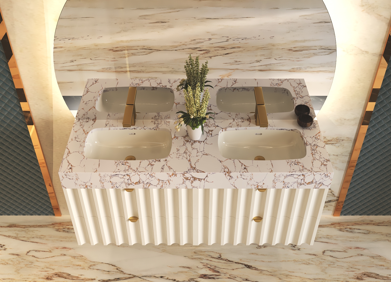 Expertly constructed from a high-quality blend of Solid Wood, Wood veneer, and MDF, the vanity ensures lasting durability alongside its elegant appearance. The design is complemented by matching gold vessel sinks and modern backlit mirrors, creating a captivating visual harmony. Functionality meets high-end style with its sleek vertical storage cabinet, providing an organized sanctuary for all your bathroom essentials.