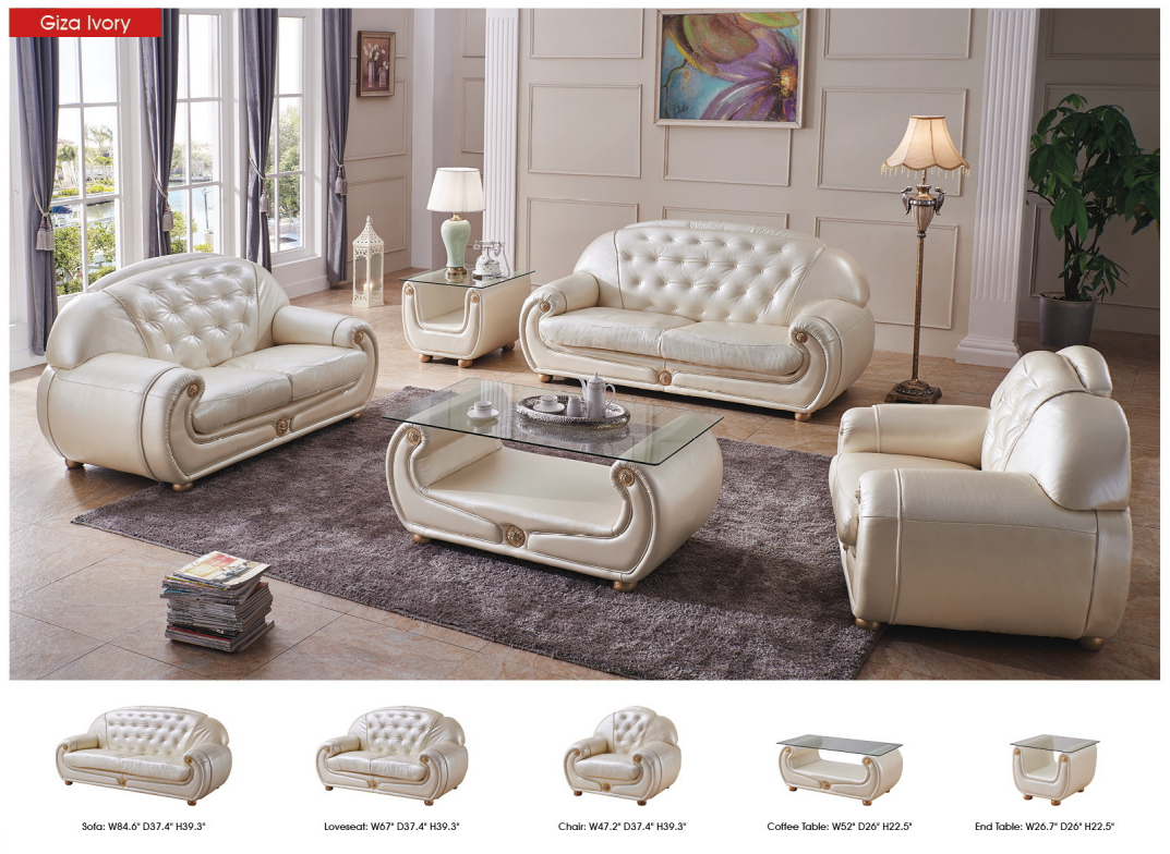 The Giza Full Leather in Beige, a centerpiece of the Extravaganza Collection by ESF, brings an air of sophisticated comfort to your home. Designed with a seat depth of 23 inches and a seat height of 19 inches, it offers an inviting embrace for relaxation. This set, featuring a sofa, loveseat, and chair, is upholstered in the finest genuine Italian leather, ensuring a touch of European luxury. The stock color #31 Beige provides a neutral yet warm palette that complements any interior design.
