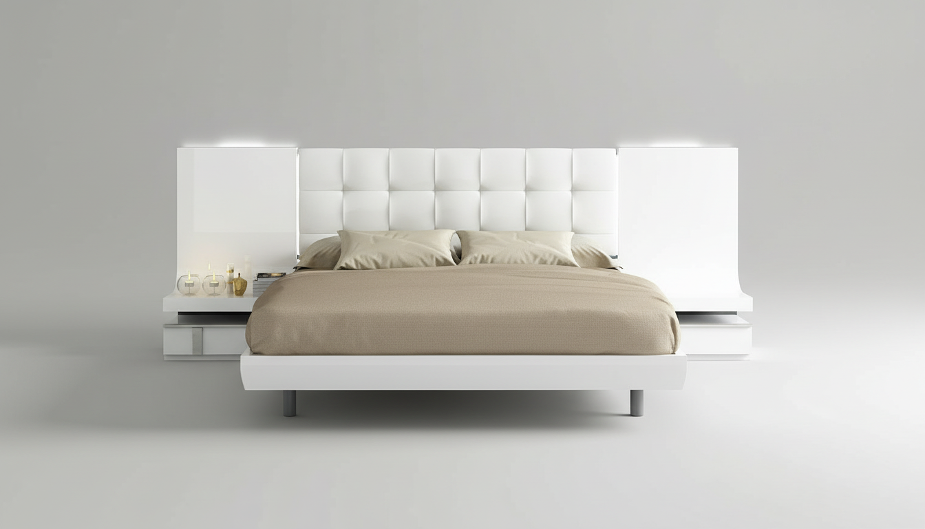 This bed is as functional as it is beautiful, featuring integrated lighting and dual switches on each wing for ultimate convenience. Available in stunning finishes like White High Gloss, Arena High Gloss, or Fabric Elfos Blanco, it caters to your specific style preferences. To ensure the best experience, a mattress height of 12 inches or less is recommended.