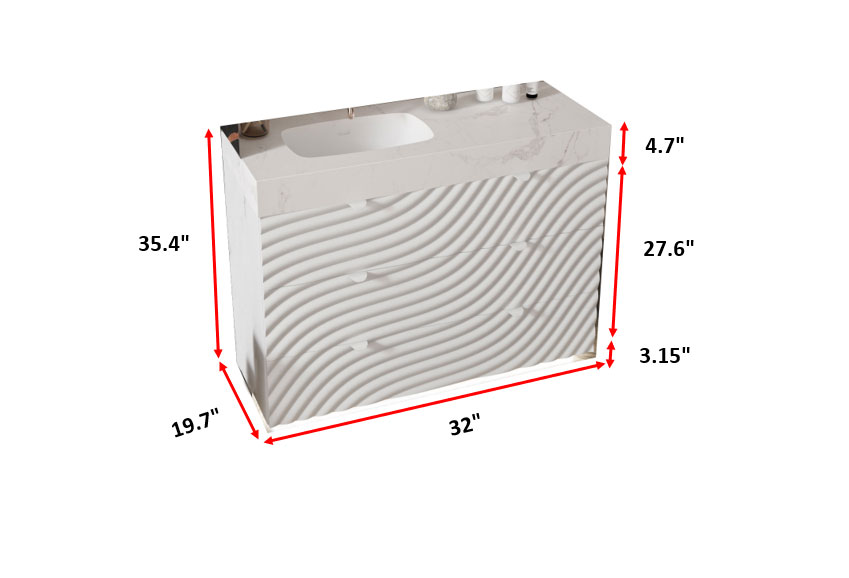 The visual appeal of this vanity is defined by its unique wave-like, textured front, which mimics the gentle movement of the Mediterranean Sea. This dynamic aesthetic is complemented by a sleek integrated sink that offers a seamless, contemporary look. To further elevate the atmosphere, the design includes integrated under-cabinet lighting. This feature casts a warm, inviting glow across the floor, highlighting the vanity’s artistic lines and making it a true statement piece in any modern bathroom setup.