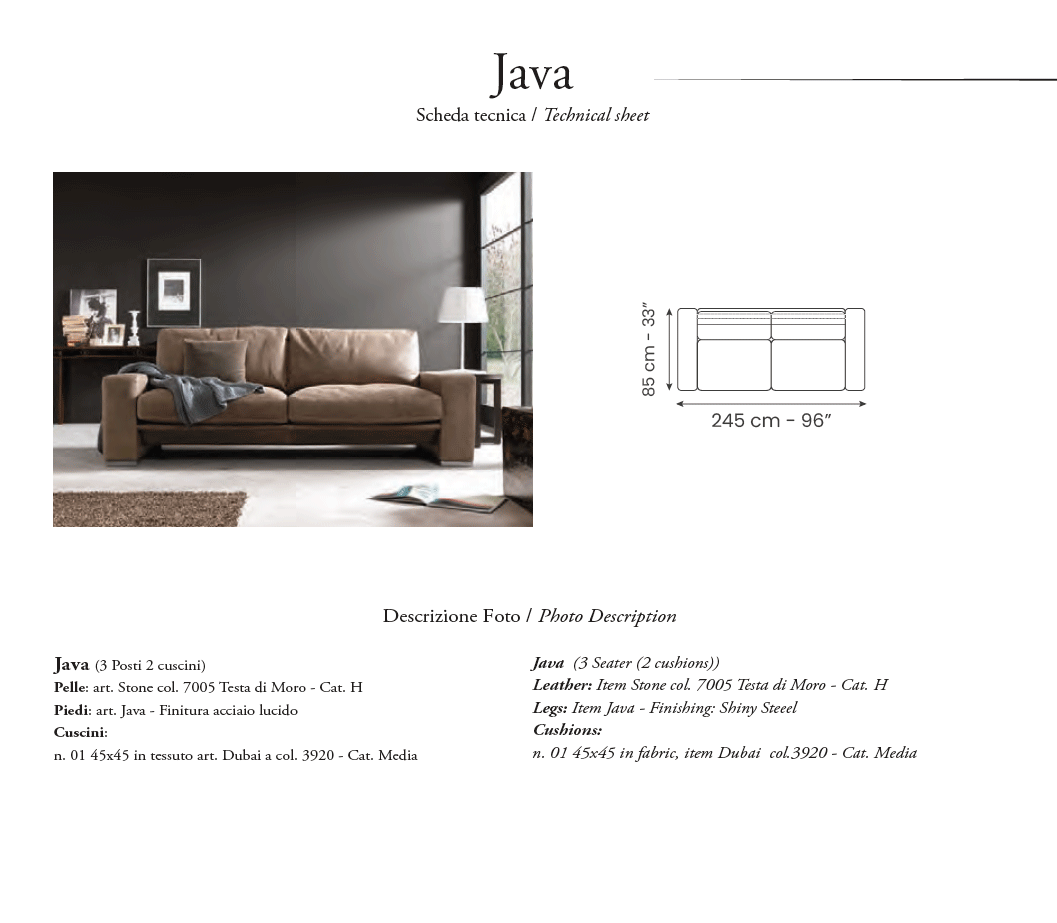 Elevate your home with the artistic flair and functional elegance of this Italian-made sectional. Whether you are hosting a formal gathering or enjoying a quiet evening, the Java provides a luxurious sanctuary. Its balanced volumes and attention to detail make it more than just furniture; it is a testament to the quality and style synonymous with New Trend Concepts Italy. Experience the perfect blend of tradition and innovation with this stunning addition to your living space.