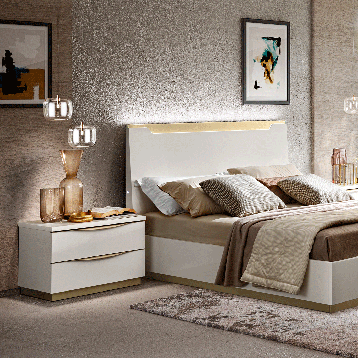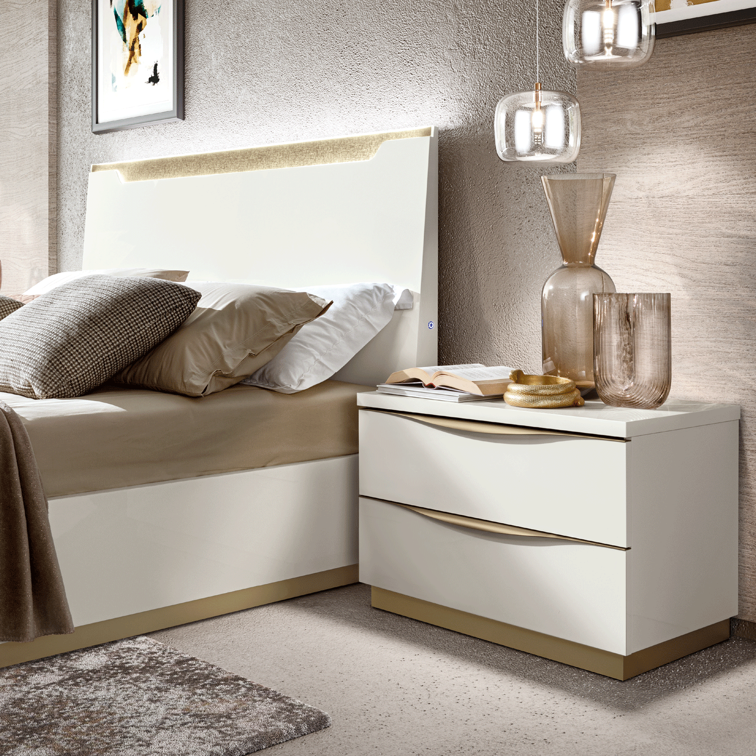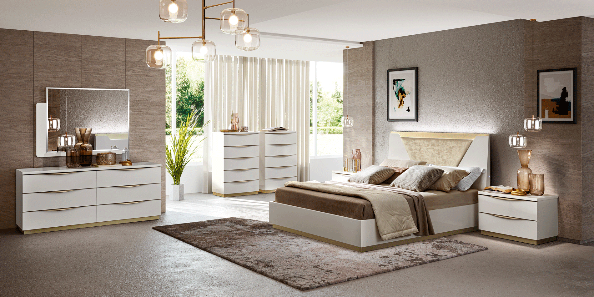 Transform your home into a gallery of modern style with the Kharma Bedroom, a standout selection from our Modern Bedrooms QS and KS. This Italian-made suite captures the essence of luxury through its shining white glossy finish and sophisticated wave-shaped aluminum handles. The base skirts, finished in brushed champagne, provide a subtle yet glamorous contrast that elevates the overall aesthetic of any contemporary sleeping space.