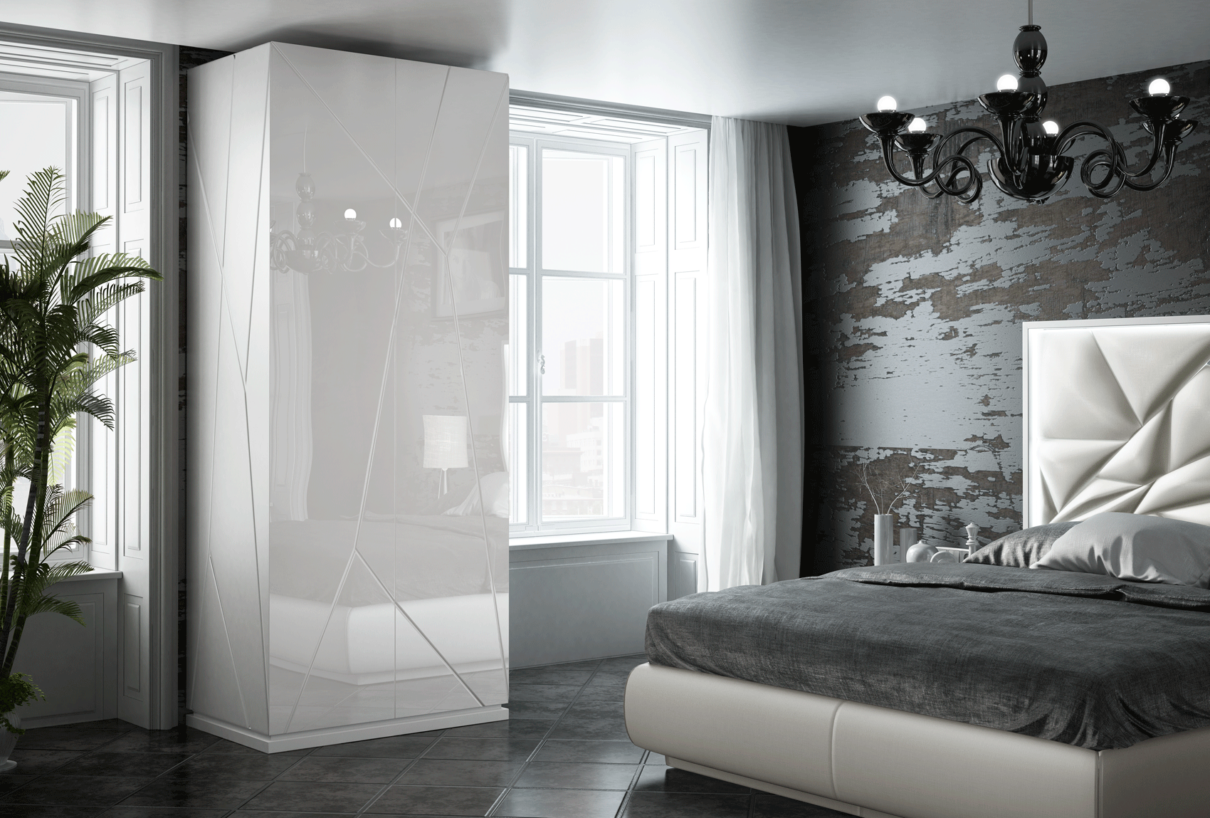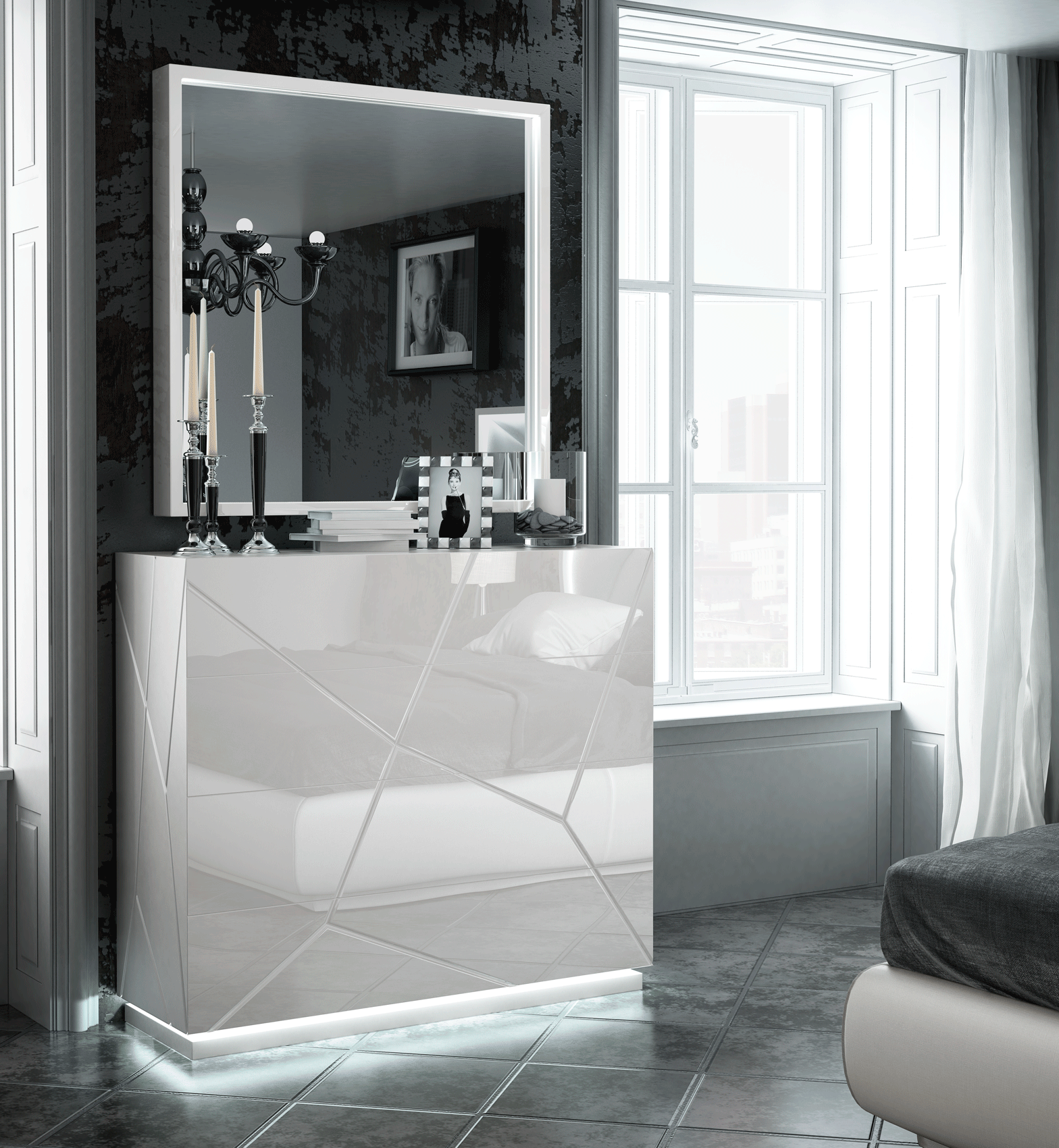Enhance your sanctuary with the Kiu Bedroom Additional Items, a collection that epitomizes the sleek aesthetics of Modern Bedrooms QS and KS. This exquisite set from the Franco Spain collection by ESF features a stunning 220 High Gloss White finish, meticulously applied to the bed, nightstands, dressers, and mirrors. The bed is further elevated by Star Nube eco-leather in a matching white finish, while the storage pieces boast a refined contrast with Carcass 120 matt and high-gloss fronts. Crafted from premium wood veneer and MDF, each piece reflects the superior quality of Spanish furniture design.
