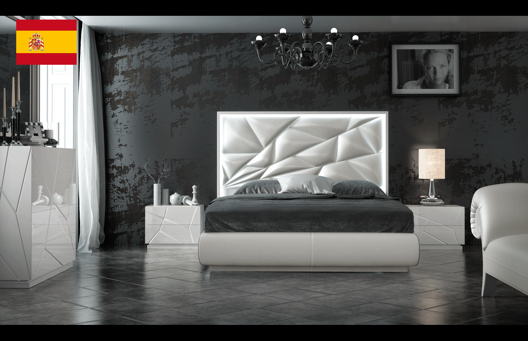 Experience the Kiu Bedroom, a masterwork of Spanish design from the Franco Spain by ESF collection that redefines the Modern Bedrooms QS and KS category. This set features a luminous 220 High Gloss White finish, meticulously applied to wood veneer and MDF for a durable, mirror-like sheen. The headboard is elegantly upholstered in STAR NUBE white eco-leather, offering a soft, tactile contrast to the sleek high-gloss surfaces. To create an ambient sanctuary, the stock bed comes integrated with atmospheric lighting around the headboard, casting a gentle glow that enhances the room’s contemporary allure.