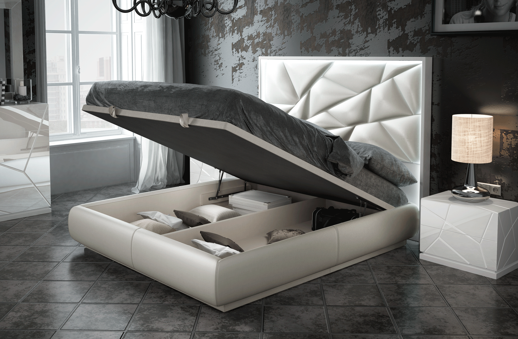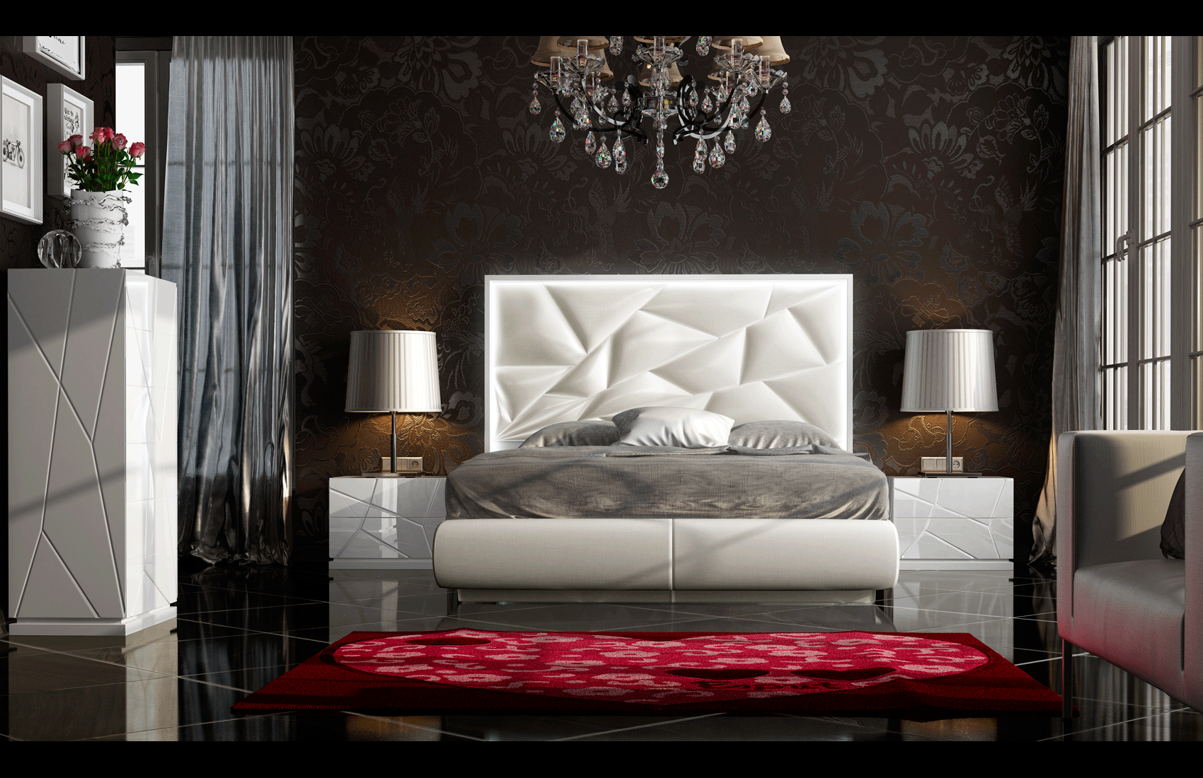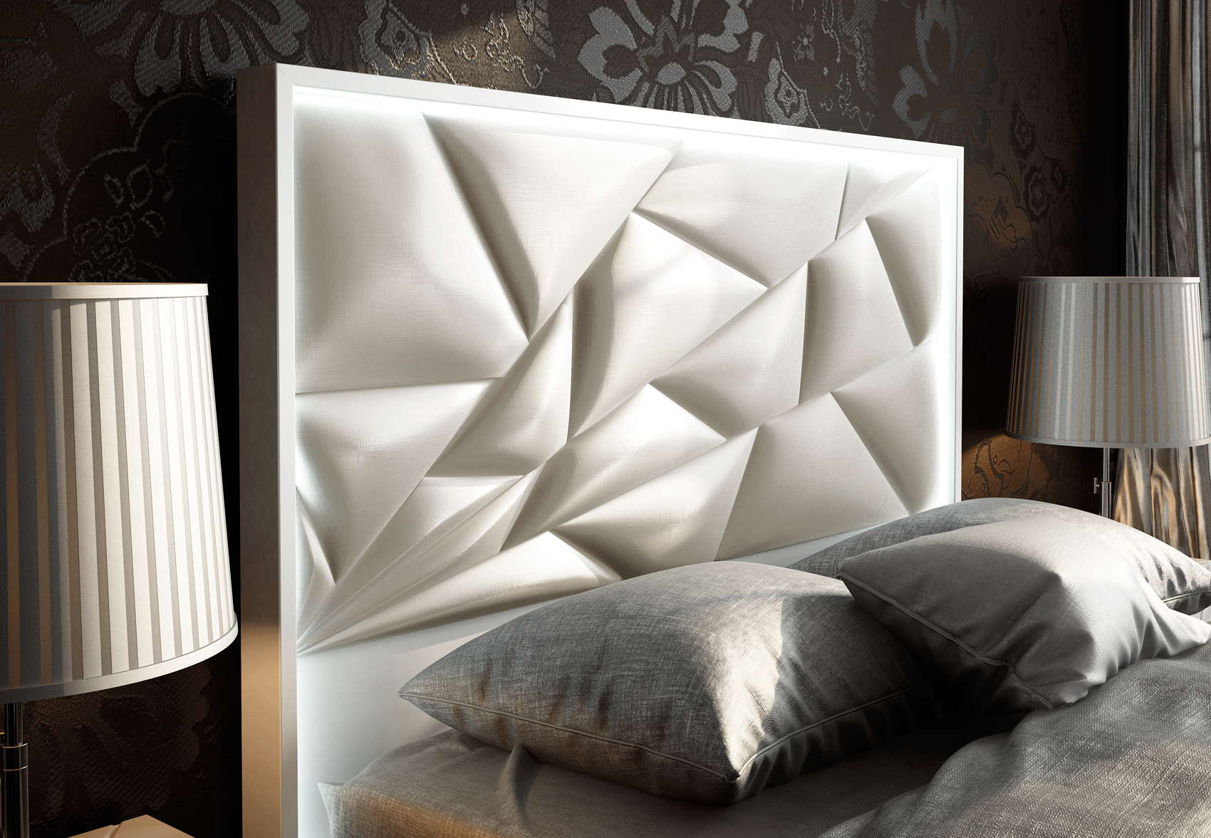 Functionality meets sophisticated artistry in every piece of this collection. The Queen Size configuration with two nightstands measures W117.72 inches by H59.06 inches and D83.86 inches, while the King Size stretches to a grand W133.86 inches. Each accompanying piece, including the dresser and chest, features a refined carcass in 120 matt finish paired with 220 High Gloss White fronts. While standard storage units arrive without integrated LEDs, special orders are available to add lighting to the nightstands, dresser, chest, and mirror for those seeking a fully illuminated aesthetic.