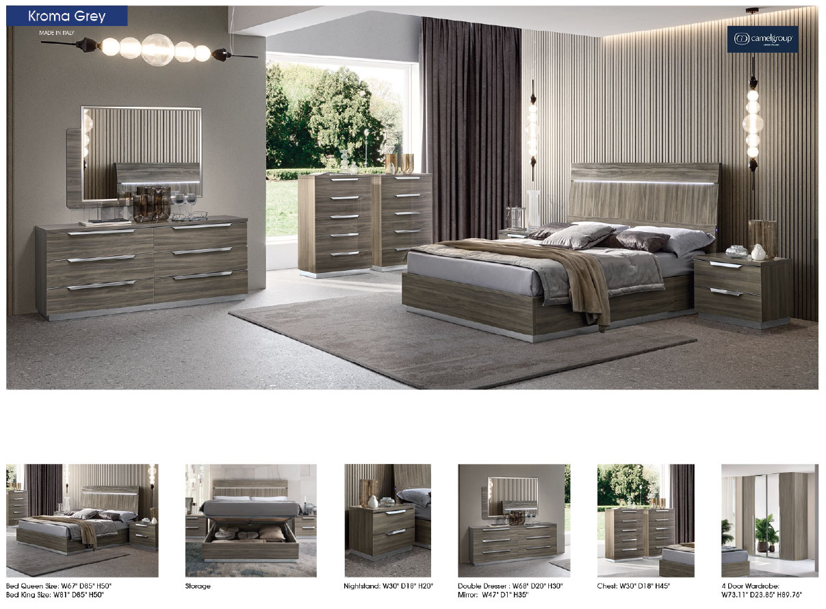 The Kroma Bed GREY is a masterpiece of Italian design, bringing a refined and modern aesthetic to your bedroom. This queen-size bed, finished in an exclusive Venetian Grey tone, features a sophisticated interplay of light and dark wood grain that adds deep visual interest and depth to your space. Part of the prestigious Camelgroup Italy by ESF collection, it serves as a stylish and versatile centerpiece, perfectly suited for contemporary interiors that demand both quality and artistic flair.
