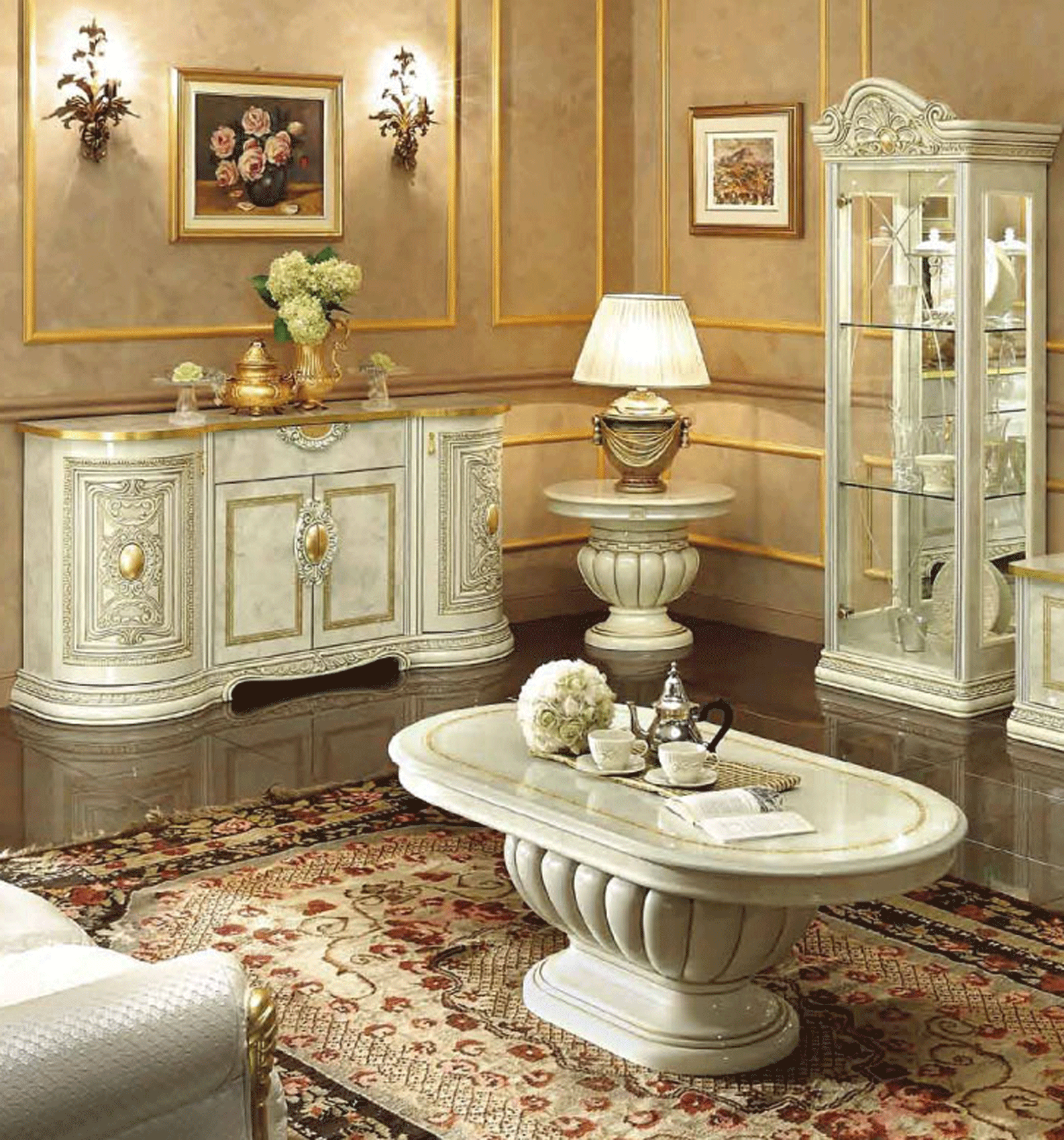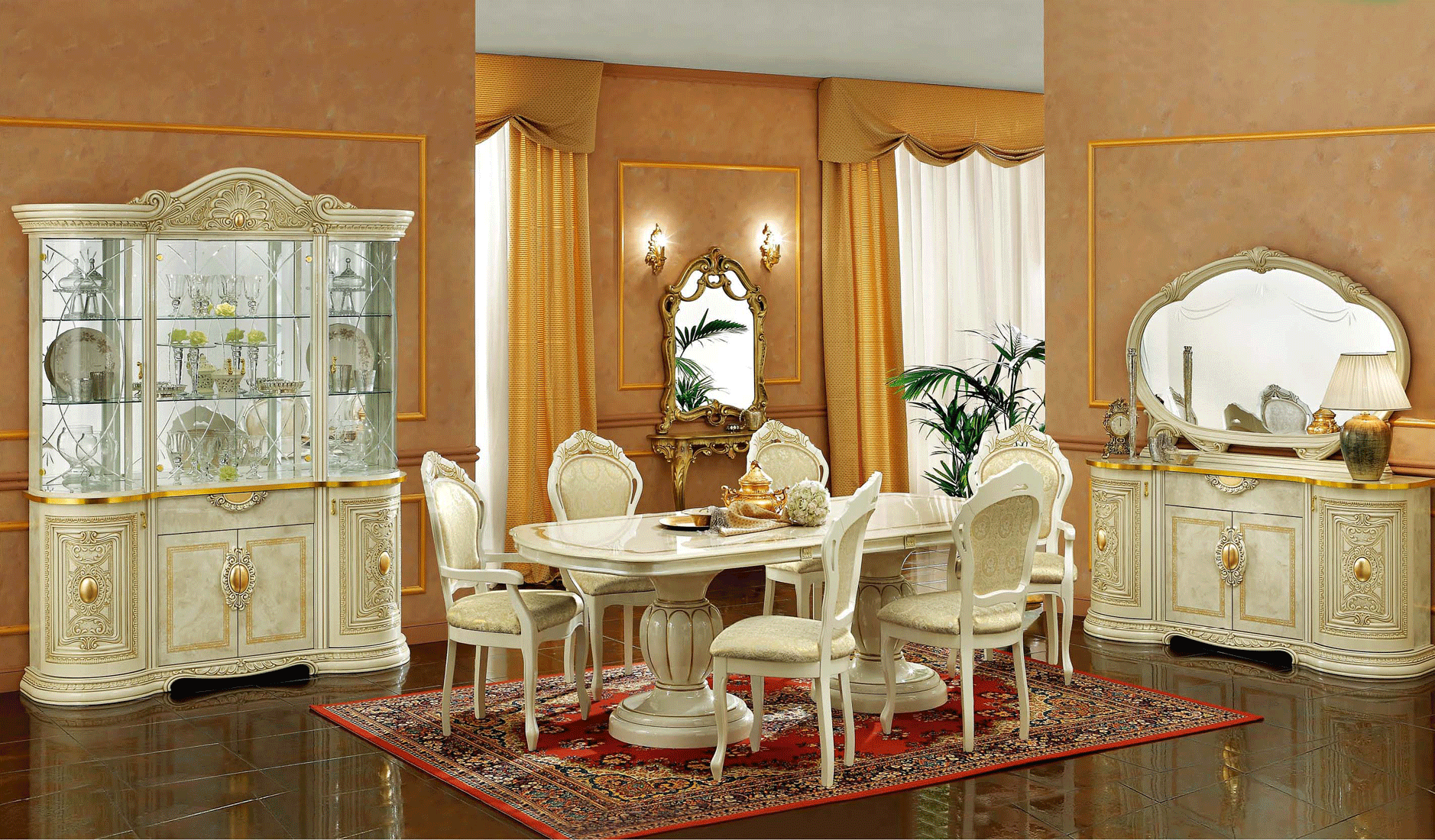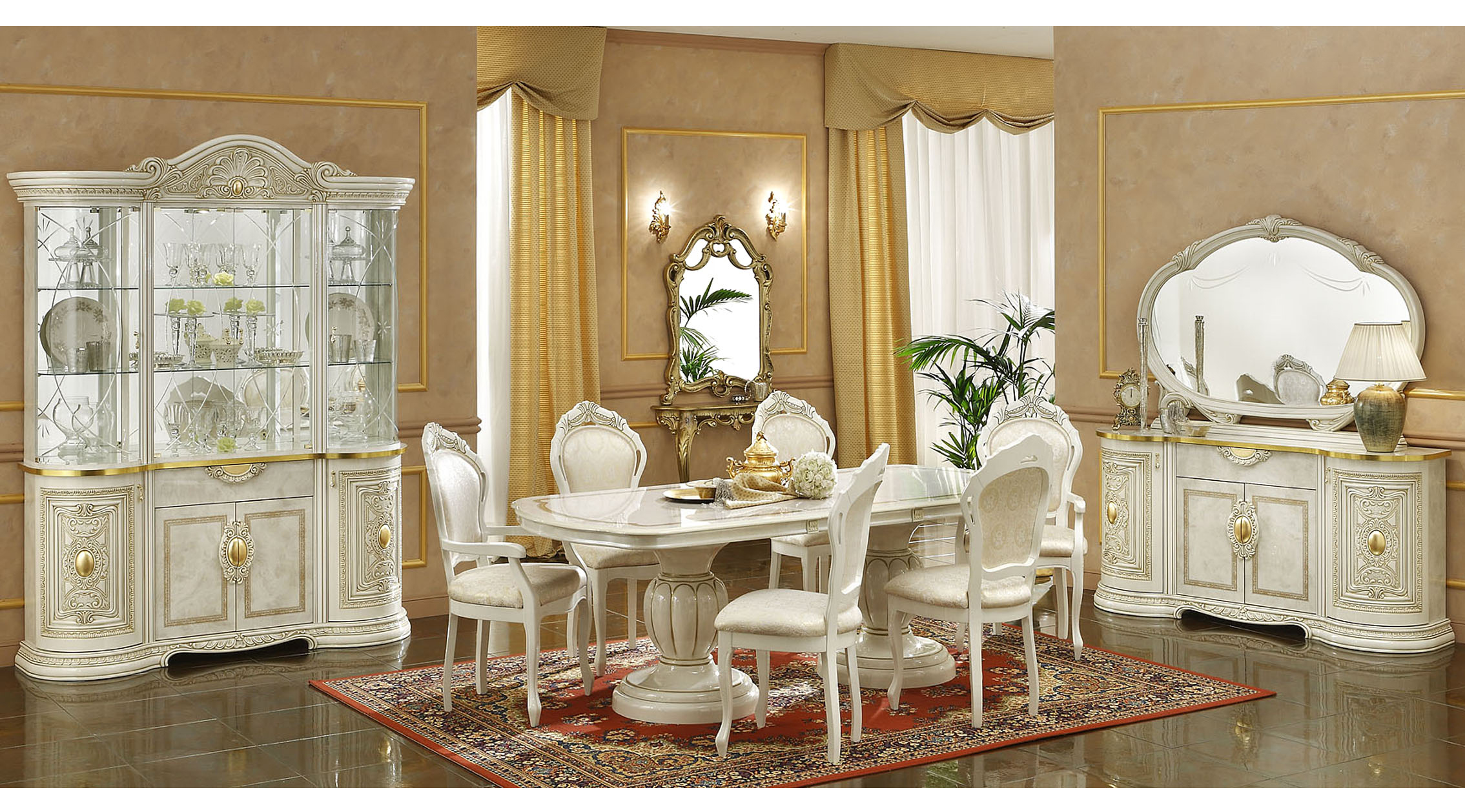 Transform your home with the Leonardo Dining collection, a masterpiece of Italian artistry from Camelgroup Italy. This Classic Dining Room Set epitomizes traditional elegance, featuring a sophisticated ivory finish enriched by ornate gold accents and hand-carved detailing. Crafted from premium wood-based panels and finished with a six-layer UV high-gloss polyester lacquer, this set offers both enduring durability and a luminous sheen. The comprehensive ensemble includes a dining table with an 18-inch extension, two armchairs, four side chairs, and a grand china cabinet, perfect for luxury formal gatherings. The upholstered chairs ensure refined comfort, while the anti-yellowing treatment preserves the set’s pristine appearance. Every element of this collection reflects a commitment to European quality, making it an ideal choice for those seeking a timeless, regal atmosphere. Professional assembly is required for the china cabinet to ensure its structural integrity.
