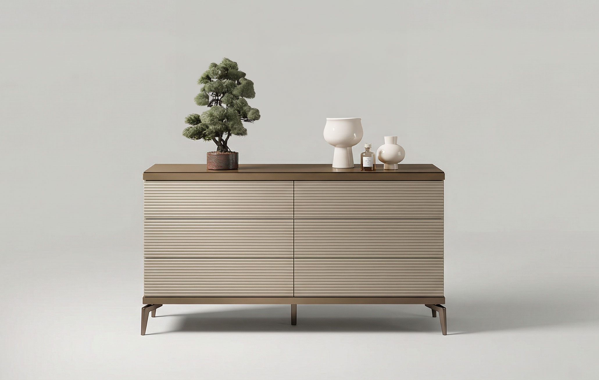 The visual allure of this dresser lies in its stunning ribbed textured fronts and soft neutral tones, which are beautifully crowned by a bronze-finished top. This combination of textures and metallic accents creates a sense of depth and modern elegance, transforming a standard storage unit into a work of art. Designed with ample drawer storage, it offers a practical solution for organizing your essentials without sacrificing the sleek, avant-garde aesthetic that defines Italian design.