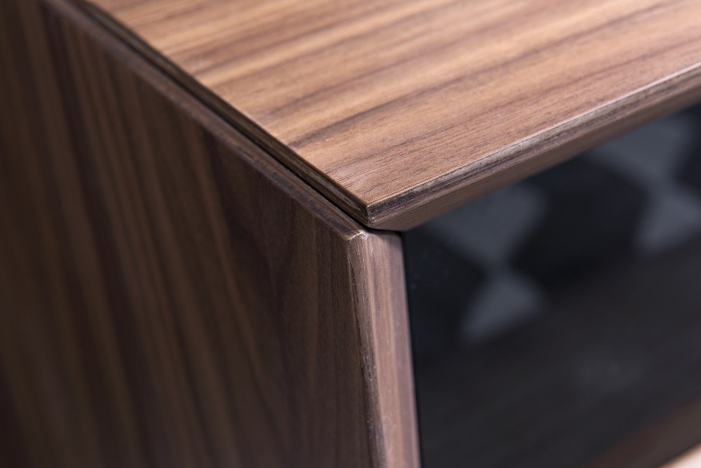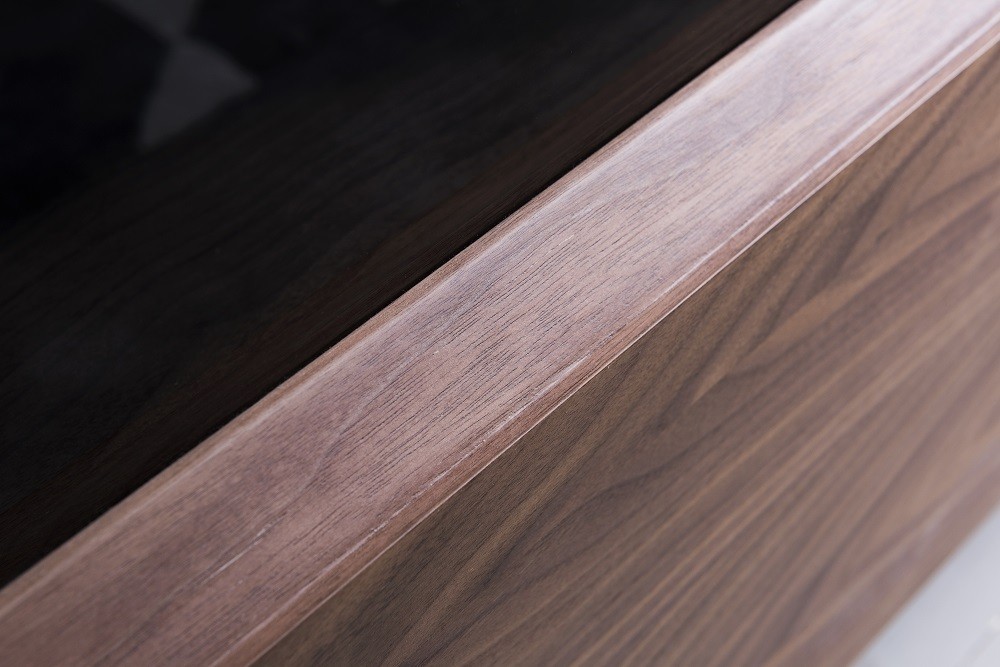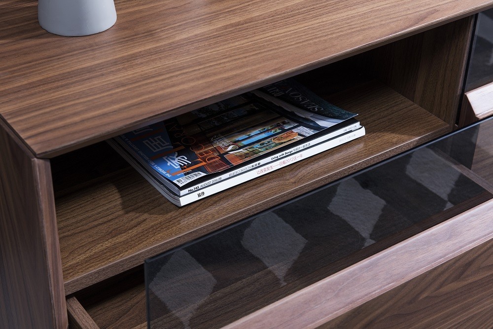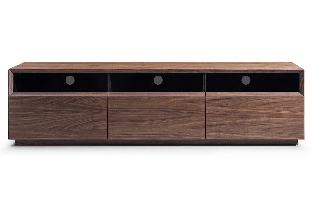 Contemporary TV stand crafted in Warm Walnut Veneer. Perfect for any kind of room setting. Also available in White High Gloss, Dark Oak, & Grey High Gloss.