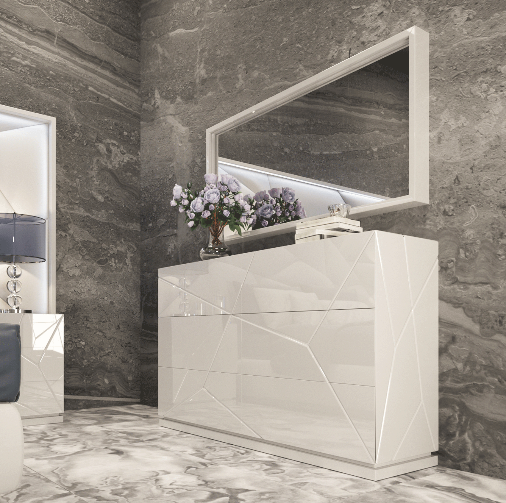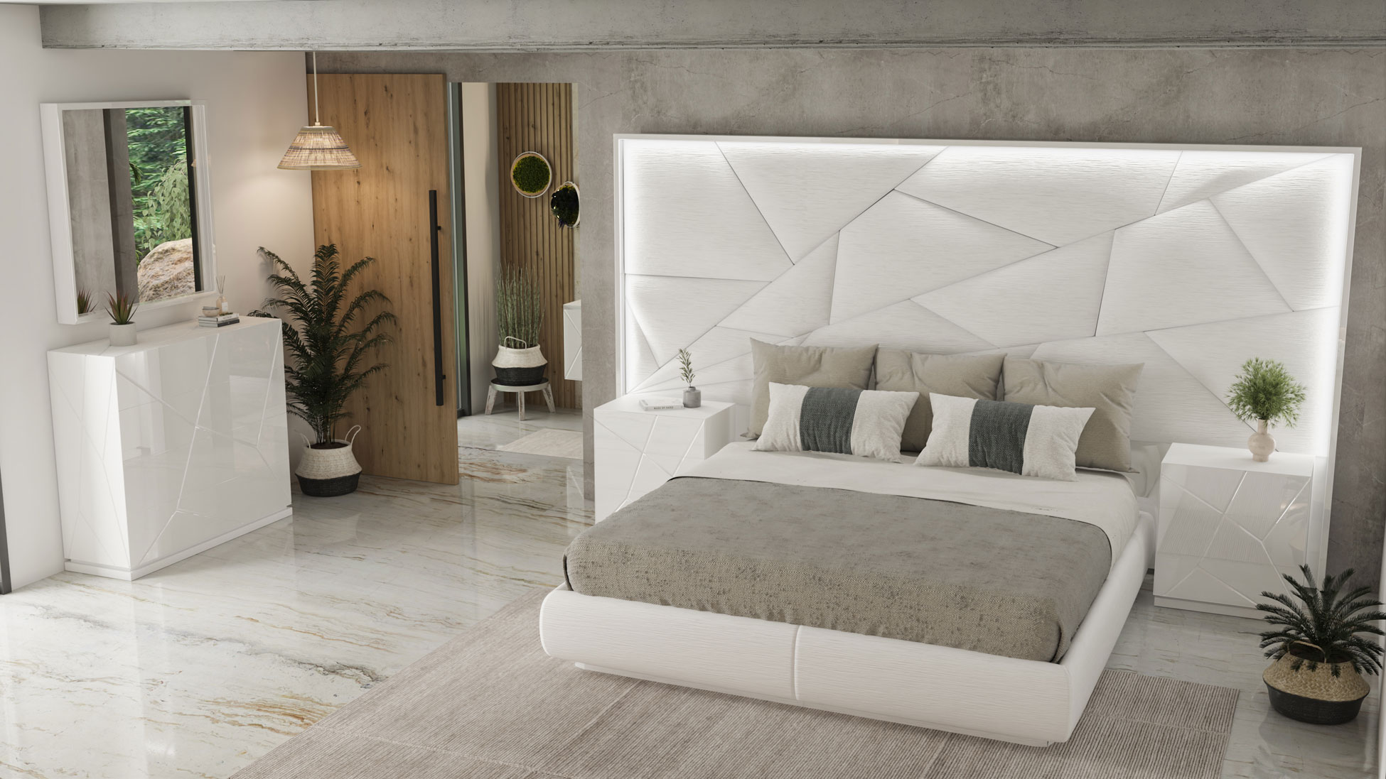 This exquisite set from our Bedroom Furniture > Modern Bedrooms QS and KS category is engineered for both visual impact and functional longevity. The bed and coordinating case goods, including nightstands, dresser, and chest, are constructed from high-quality MDF and wood veneer with 120 matte carcasses and 220 high-gloss fronts. Because of the sophisticated integrated lighting and complex geometric detailing, professional assembly is required to ensure every element of this European masterpiece is perfectly aligned for your daily enjoyment.