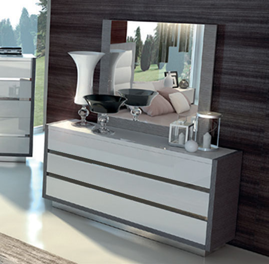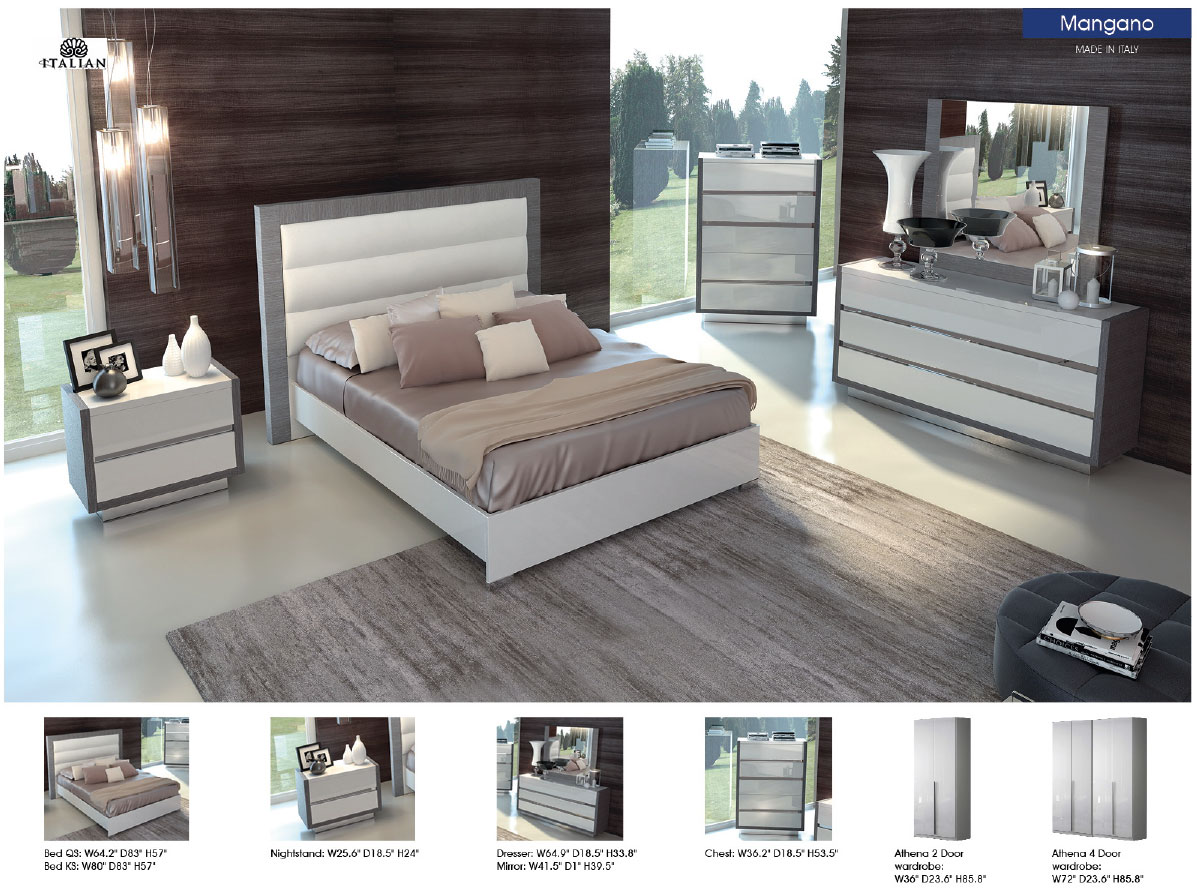 The Mangano Bedroom collection, a centerpiece of our Modern Bedrooms QS and KS, masterfully blends high-gloss white and brownish-grey finishes to create a sanctuary of refined elegance. This Italian-made masterpiece features clean architectural lines and a white base on case goods, ensuring a cohesive and minimalist aesthetic. Designed for those who appreciate the finer things, the collection eliminates metal chrome between drawers for a seamless, uninterrupted look that speaks to its superior craftsmanship.