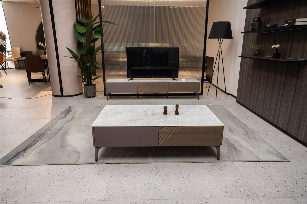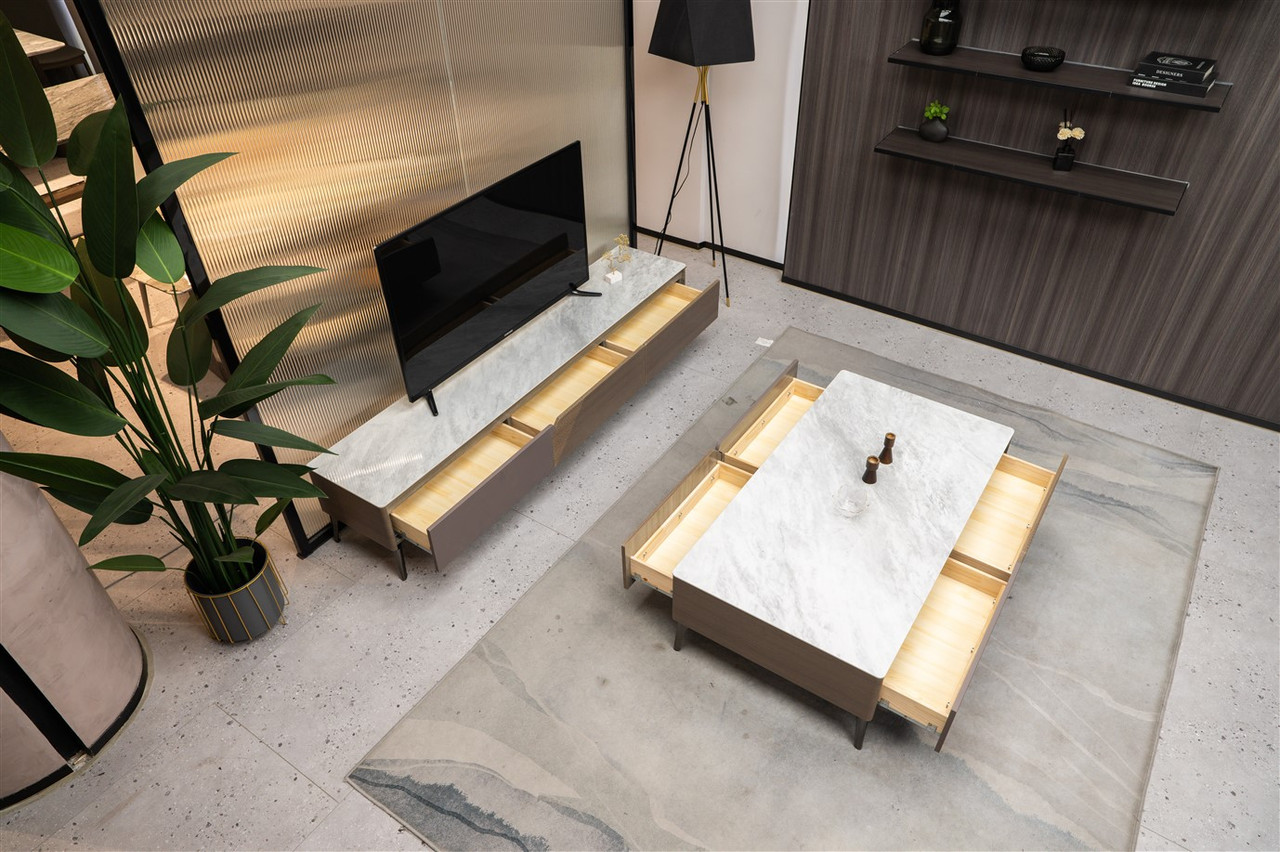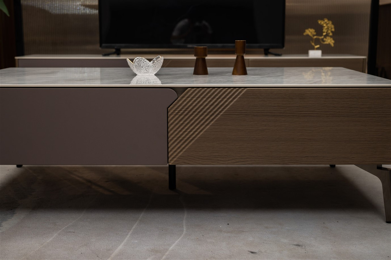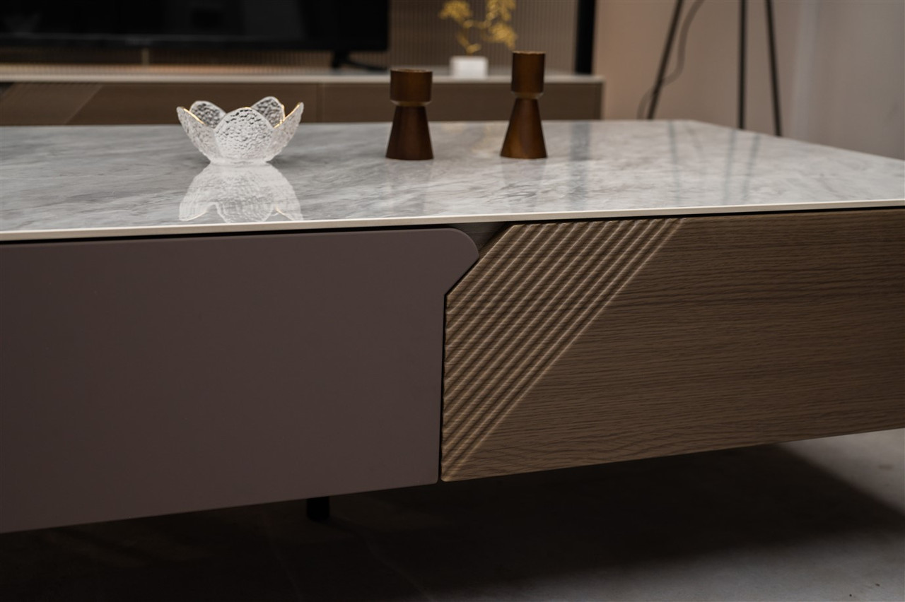 2219 Mia Coffee Table with Carrera Style Porcelain Top with Storage in Walnut and Gray Frame 51x…