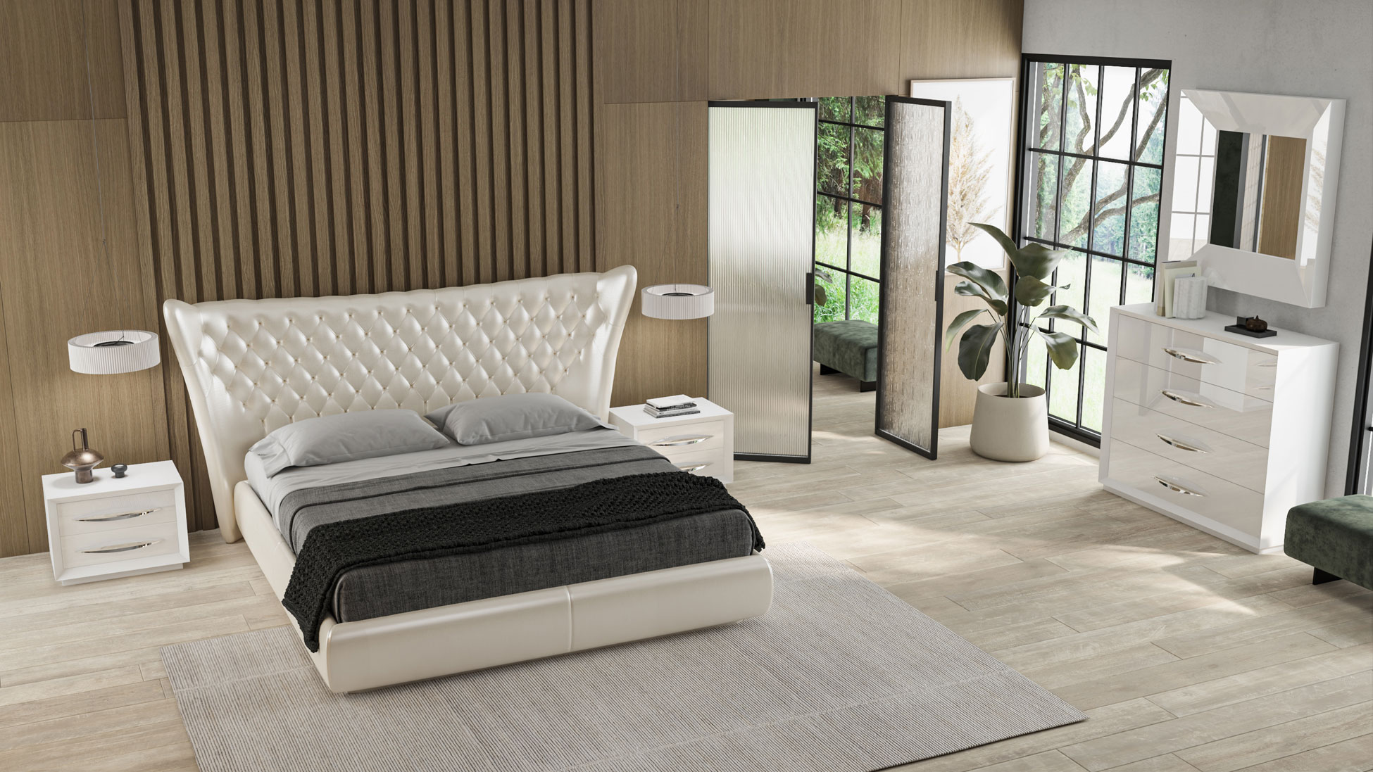 Crafted with meticulous attention to detail in Spain, the Miami Bedroom collection from the Franco Spain by ESF line is a testament to sophisticated European artistry. This set, featuring a queen-size bed, nightstand, dresser, and mirror, harmonizes wood veneer and MDF with a stunning high-gloss white finish. The bed’s headboard and frame are upholstered in luxurious white eco-leather with a Star Nube finish, providing a soft, tactile contrast to the sleek surfaces. High-end SERIK II metal handles and self-closing drawer mechanisms underscore a commitment to quality and effortless daily use.