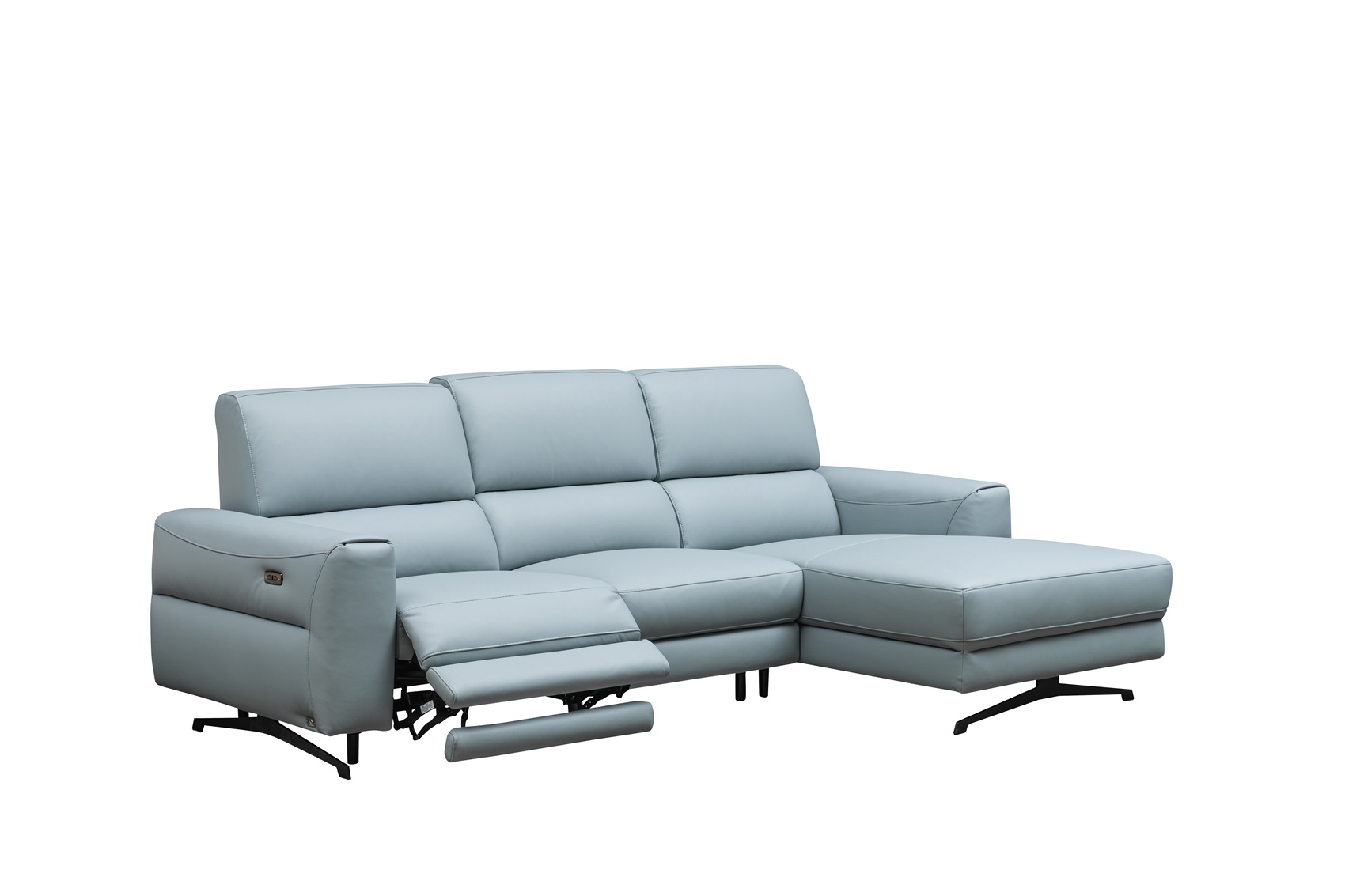 Expertly crafted by Klaussner Living, this stunning piece features a right-side chaise and sleek black metal legs that provide a contemporary edge. The light-blue upholstery brings a fresh, airy feel to any interior, while the use of special order materials ensures a high-quality finish that stands the test of time. Whether you are reclining after a long day or enjoying a movie night, the Mila recliner sofa offers the functional versatility and artistic flair your home deserves. This sectional’s thoughtful design and premium construction reflect a commitment to excellence, ensuring it remains a beloved fixture in your refined living environment for years to come.