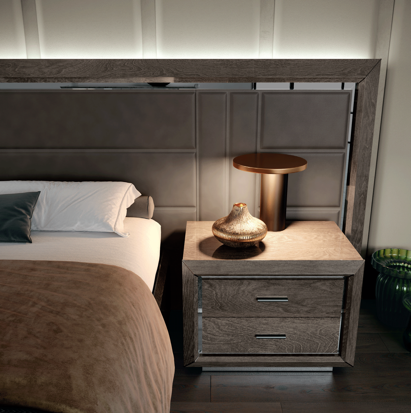 Bring a touch of European sophistication to your home with the Mirage Elite Bedroom, a masterpiece of Italian design from the Camelgroup Italy by ESF collection. Expertly crafted in Italy, this set features a stunning headboard upholstered in premium fabric, showcasing elegant geometric lines achieved through a unique, handcrafted double stitching technique. As a standout choice for Modern Bedrooms QS and KS, this collection captures the essence of luxury with diamond-shaped frames joined at 45-degree angles by sleek nickel plates, a signature motif of the Day and Night Elite series.