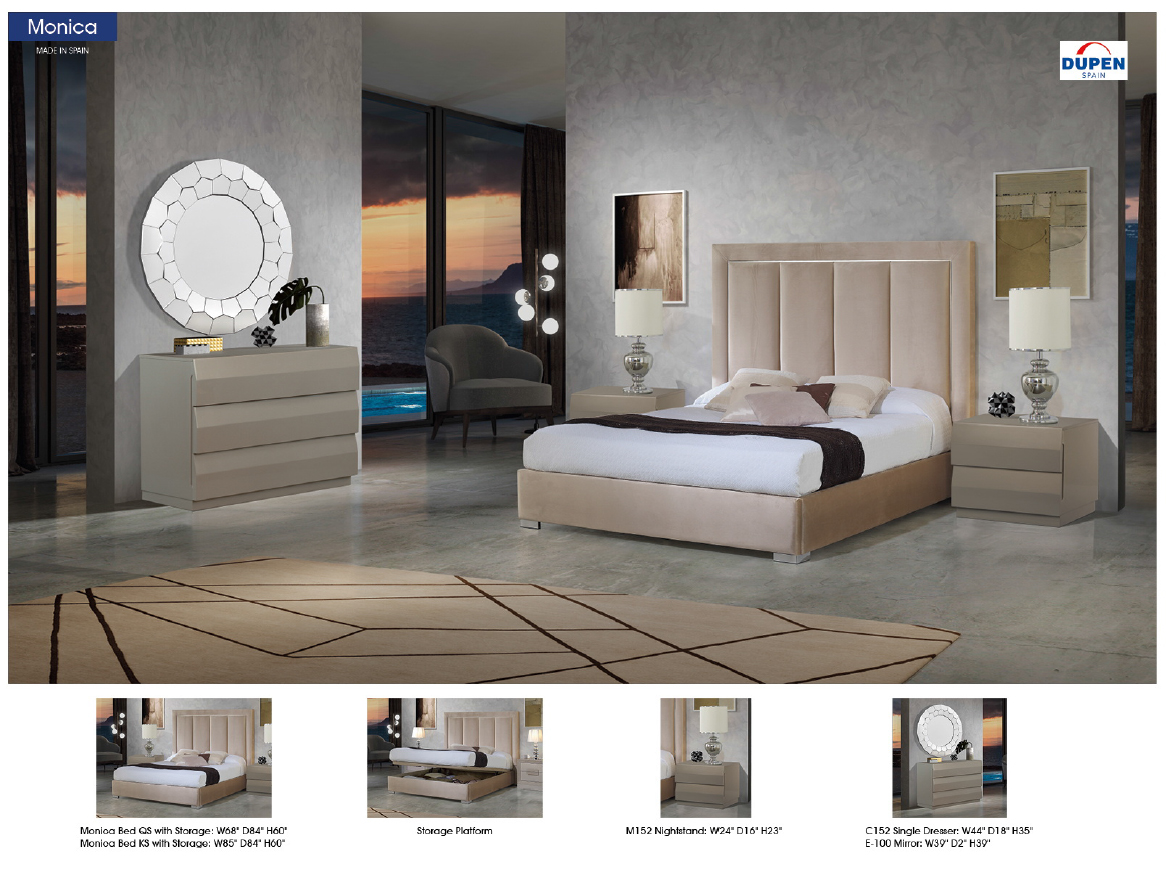 The Monica bed with Storage from the Dupen Spain by ESF collection is a masterclass in modern European design. Meticulously crafted in Spain, this piece features a luxurious beige velvet finish (Serie B – Ref Color GL 05 Beige) that brings a soft, tactile elegance to your home. Its sophisticated construction utilizes high-quality wood veneer and MDF, ensuring a sturdy foundation that lasts for years. This bed is a standout selection within our Bedroom Clearance category, offering a perfect blend of high-end style and practical value.