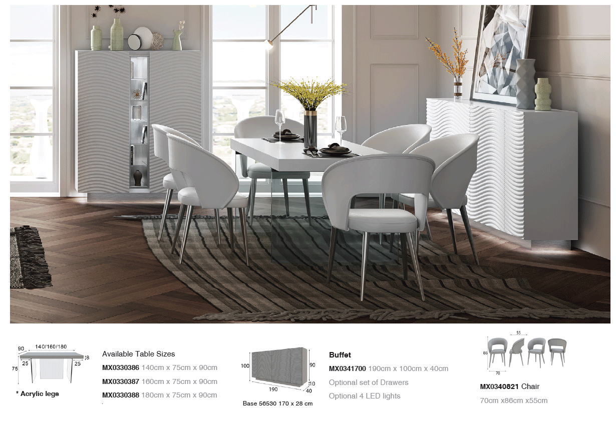 Experience the MX03, a masterpiece of Spanish craftsmanship from the Franco Spain by ESF collection. This Modern Dining Room Set represents the pinnacle of contemporary elegance, blending functional design with artistic flair. Meticulously constructed from premium wood veneer and MDF with glass accents, the MX03 offers a sophisticated aesthetic that transforms any meal into a refined gala. As part of our premier Dining Room Furniture, this set allows for extensive personalization; choose from a variety of matte or metallic lacquers and select your preferred upholstery from our curated swatch book without any surcharge. For those seeking a more luminous presence, high gloss finishes are available to elevate the fronts or the entire piece. Whether you are hosting a formal dinner or enjoying a quiet evening, the MX03’s balanced volumes and superior materials ensure a lasting impression of quality and style in your American home. Each piece is designed to harmonize perfectly with your most refined interior elements.