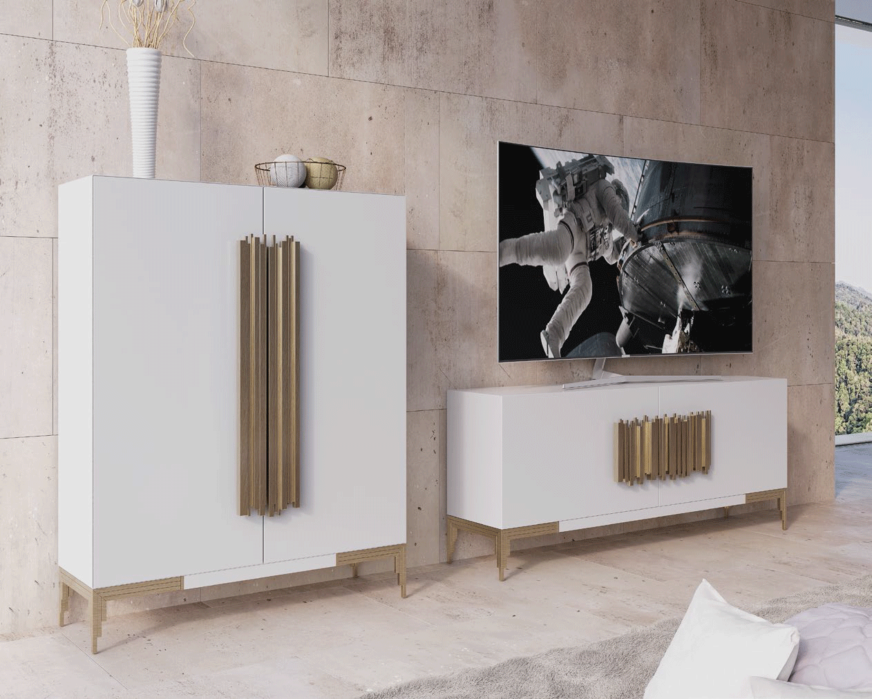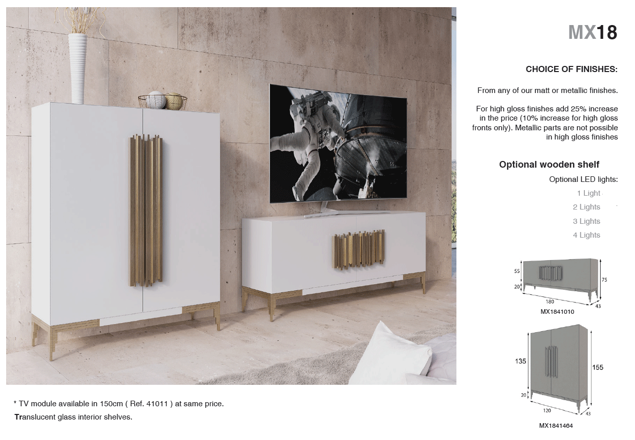 The MX18 offers remarkable versatility with various finish options to match your unique interior palette. Choose from an array of matt and metallic lacquers without a surcharge, or opt for a 25% increase to achieve a luxurious high-gloss finish. While the TV compositions are sold as complete sets to ensure a cohesive look, other individual pieces can be ordered separately to customize your layout. The inclusion of special order materials ensures that every detail of this entertainment center meets the highest standards of luxury.
