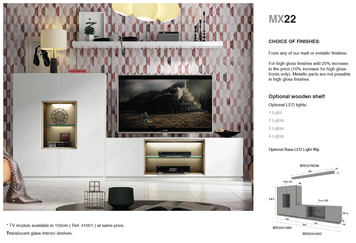 Personalization is a key feature of the MX22 series, allowing you to define your space with a variety of finishes. You can choose from an extensive range of matte or metallic lacquers without a surcharge, or select from premium upholstery fabrics to suit your tactile preferences. For those desiring a more luminous look, high-gloss options are available for a price increase, adding a radiant glow to your room. While TV compositions are sold as complete sets to maintain design integrity, additional modules can be acquired individually to fit your specific room layout.