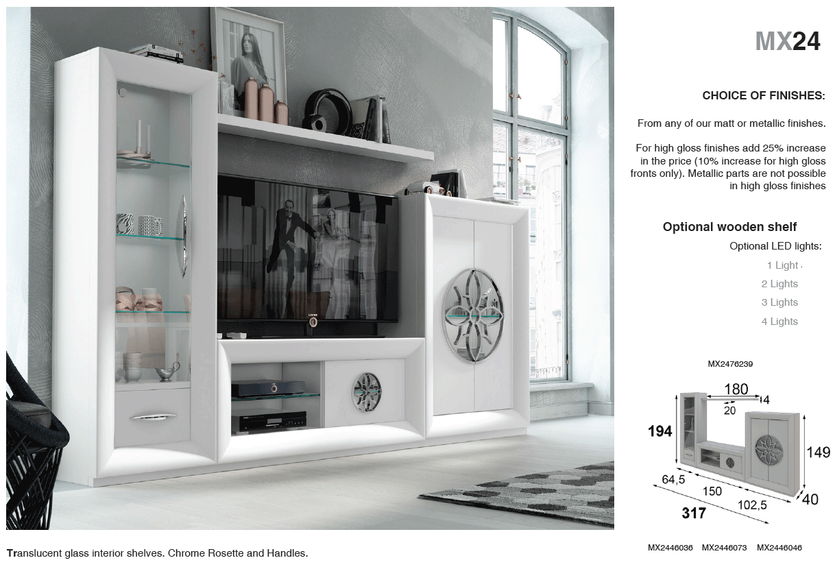 The MX24 is a stunning example of modern Spanish craftsmanship, masterfully created by Franco Spain by ESF. As a standout piece in our Wallunits and Entertainment Centers collection, this unit brings a sleek, contemporary aesthetic to any living space. Each component is meticulously crafted in Spain, ensuring a level of quality and durability that is second to none. Built from premium materials like wood veneer and high-quality MDF, this entertainment center is designed to be a long-lasting centerpiece for your home.