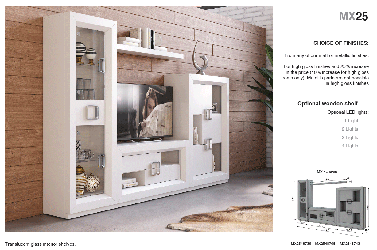 The MX25 entertainment center is a masterful expression of modern European design, meticulously crafted in Spain. As a standout selection from our Wallunits and Entertainment Centers, this unit transforms your living area into a sophisticated media hub. This collection, Franco Spain by ESF, is built with a resilient combination of wood veneer and high-quality MDF, ensuring lasting beauty and structural integrity.