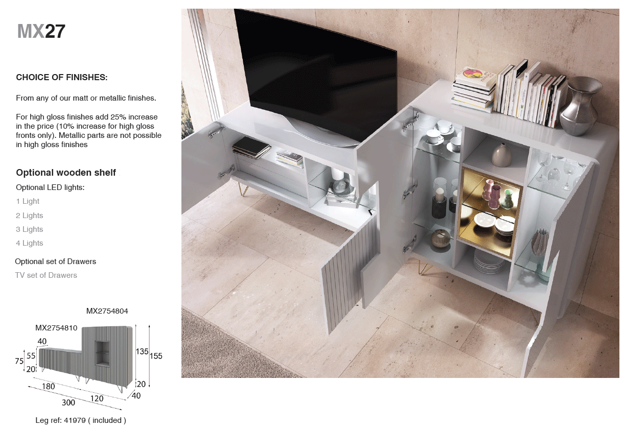 Customization is at the heart of the MX27, allowing you to tailor the finish to your unique taste. You can choose from a wide array of matte and metallic lacquers without a surcharge, or select upholstery from our extensive swatch book to create a personalized touch. For those seeking a more radiant look, high-gloss finishes are available with a 25% increase (10% for fronts only), adding a luxurious sheen to your modern entertainment setup.