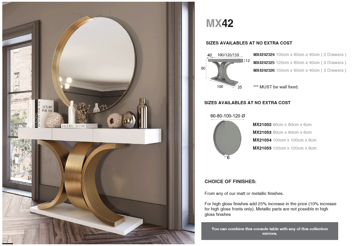 The MX42 console table from the Franco Spain by ESF collection is a testament to the artistry of Spanish furniture making. Expertly crafted in Spain, this modern console serves as a sophisticated anchor for your home, bridging the gap between functional furniture and high-end decor. It belongs to our exquisite selection of Wallunits, Hallway Console tables and Mirrors, designed to elevate the aesthetic of any contemporary entryway or living space with its clean lines and refined presence.