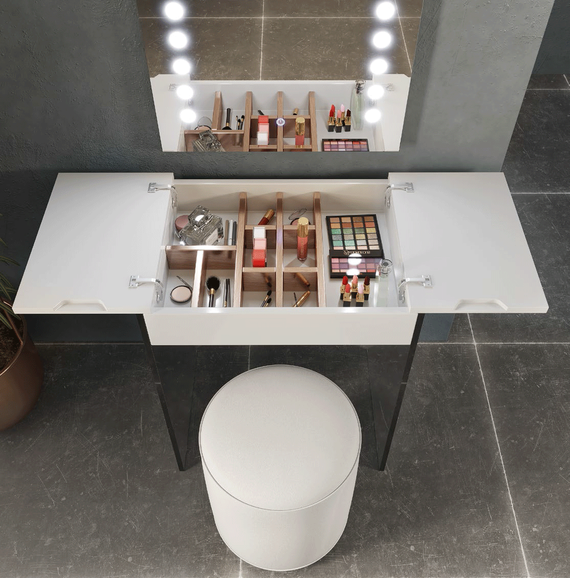 Customization is at the heart of this design, allowing you to tailor the finish to your unique taste. You can select from a wide array of matte and metallic lacquers or choose upholstery from our extensive swatch book without any surcharge. For those seeking a more luxurious touch, high gloss finishes are available with a 25% increase (10% for fronts only), though please note these are not available for metallic parts. Whether used as a dedicated grooming station or a chic storage solution, its balanced proportions and sleek lines make it a versatile addition to any home.