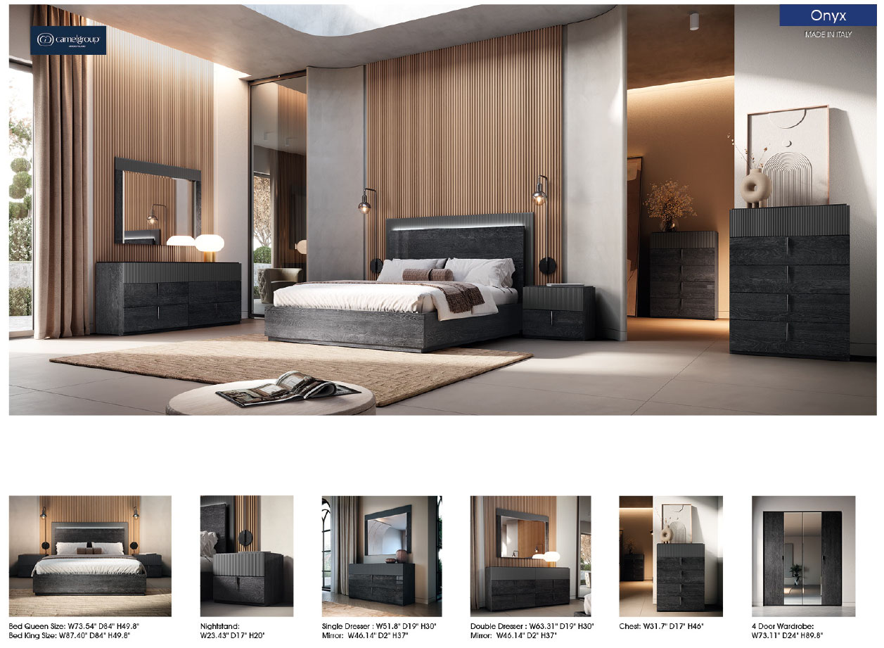 Innovation meets comfort in this exquisite set, which is designed for both Modern Bedrooms QS and KS. A standout feature is the integrated dimmer touch sensor built directly into the bed, allowing for effortless lighting adjustments to suit your mood. Simply press and hold the sensor to gradually increase brightness, then release and press again to dim. This thoughtful detail ensures your bedroom is not only a gallery of Italian design but also a functional retreat tailored to your needs. From the metallic accents to the glossy surfaces, every element of the Onyx Bedroom reflects a commitment to artistic flair and refined living.