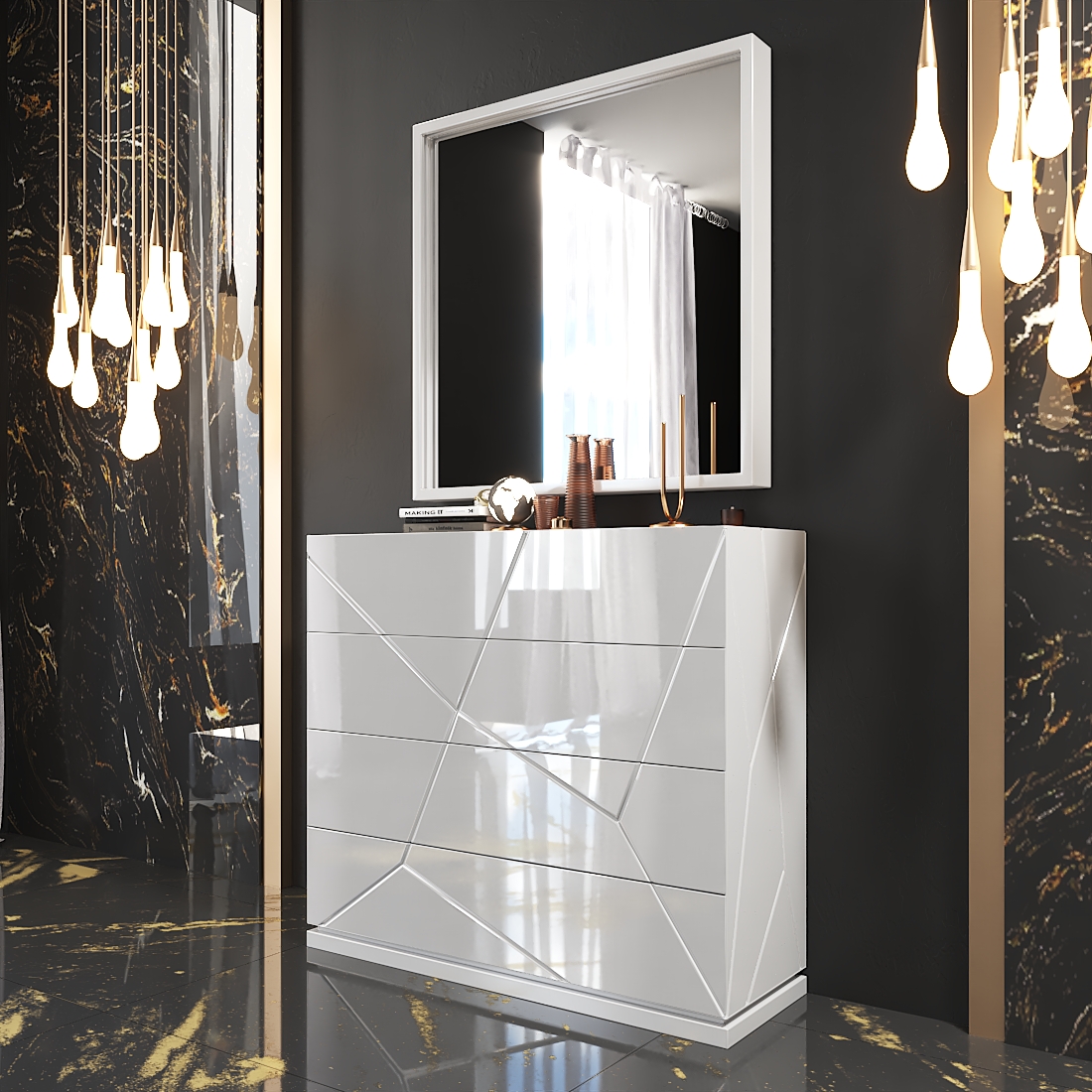 The Orion Bed with Kiu cases is a masterpiece of European craftsmanship, expertly made in Spain by Franco Spain for ESF. This exquisite piece from our Modern Bedrooms QS and KS collection brings a futuristic aesthetic to your sanctuary, blending a crisp white finish with innovative design elements. The headboard serves as a stunning focal point, upholstered in premium eco-leather and featuring an intricate, beautiful pattern that is further enhanced by integrated LED lighting. This glowing detail creates an inviting, sophisticated ambiance perfect for modern living.