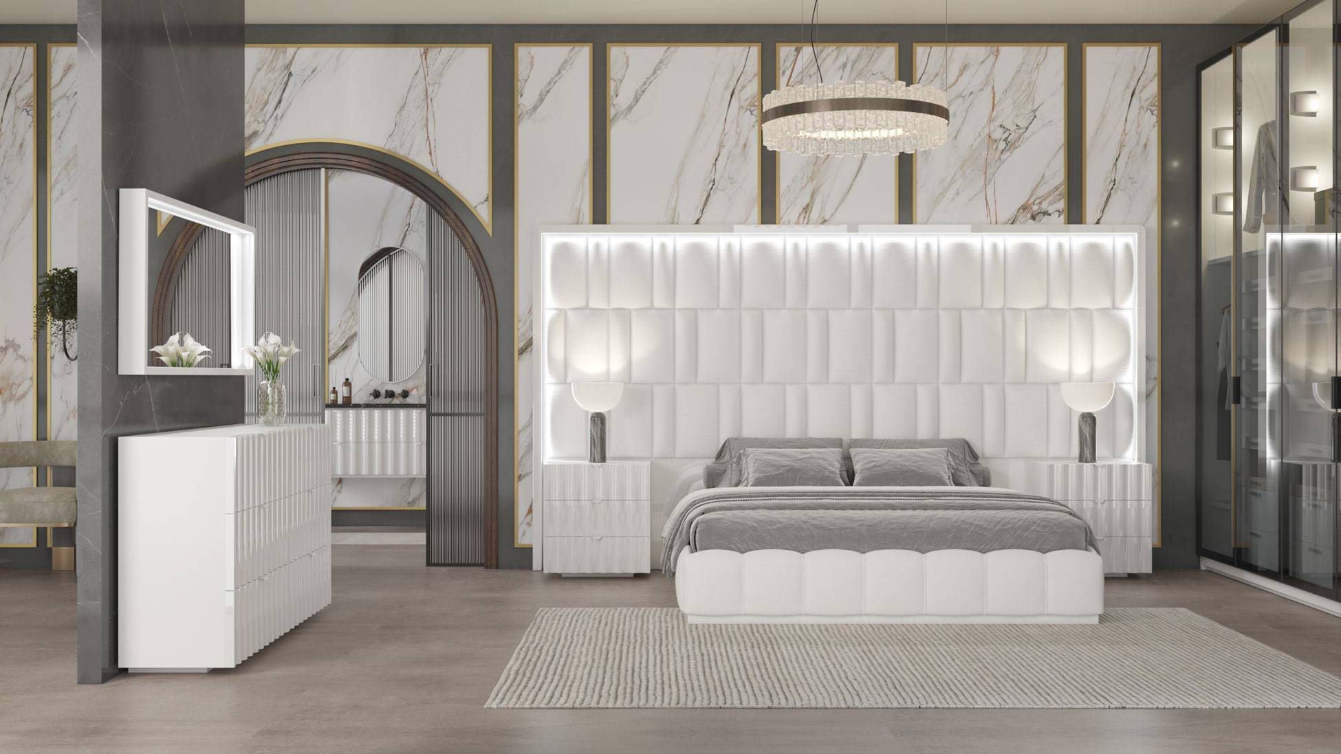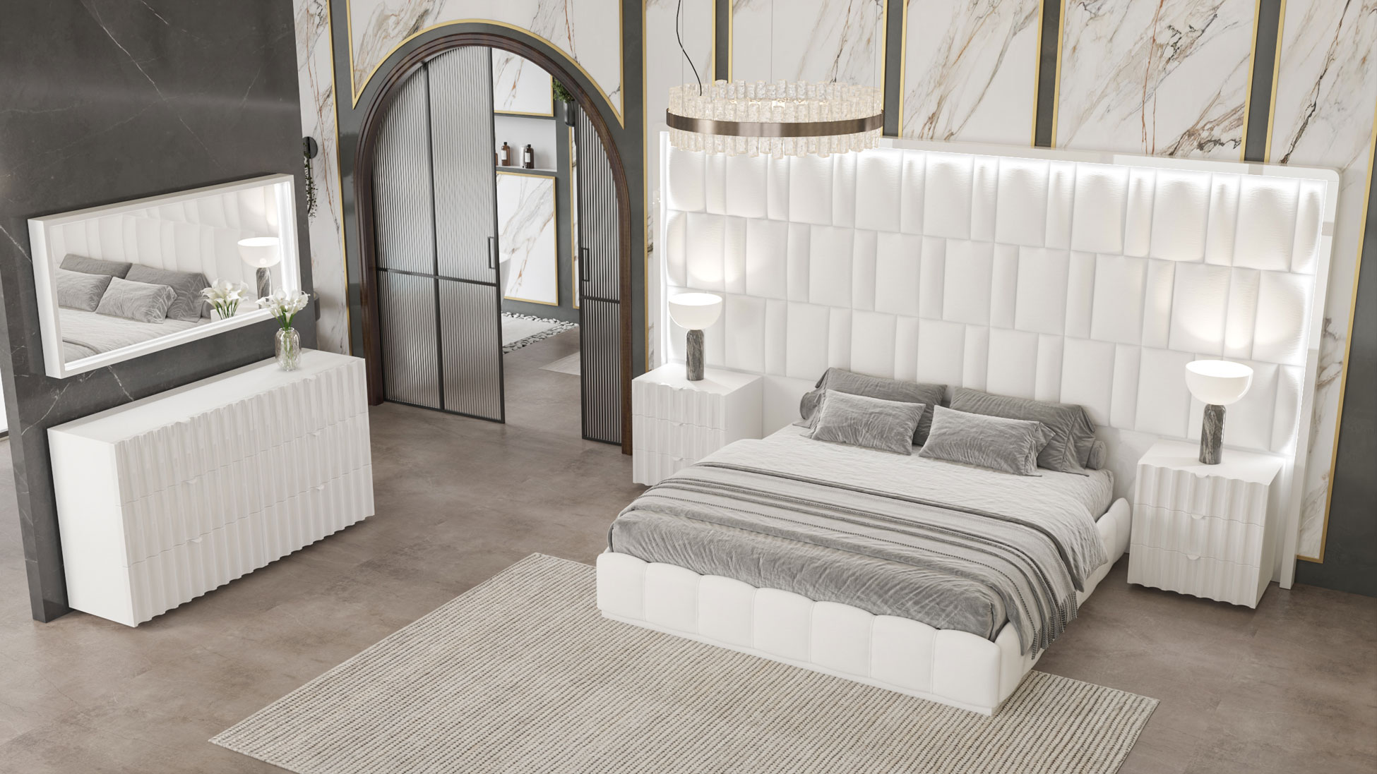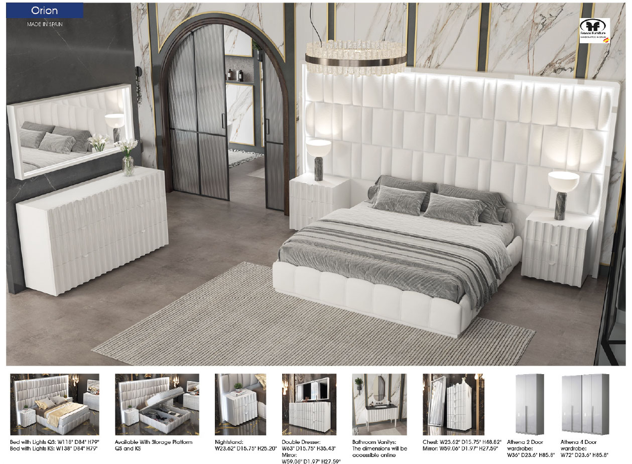 The Orion Bed by Franco Spain by ESF is a Spanish-crafted masterpiece featuring a glossy white MDF frame and a plush eco-leather headboard. Integrated LED lighting creates a serene atmosphere, while the intricate pattern and futuristic silhouette bring high-end style to any modern bedroom. Available in King or Queen sizes with optional storage, it perfectly balances avant-garde design with practical utility for a clutter-free sanctuary.