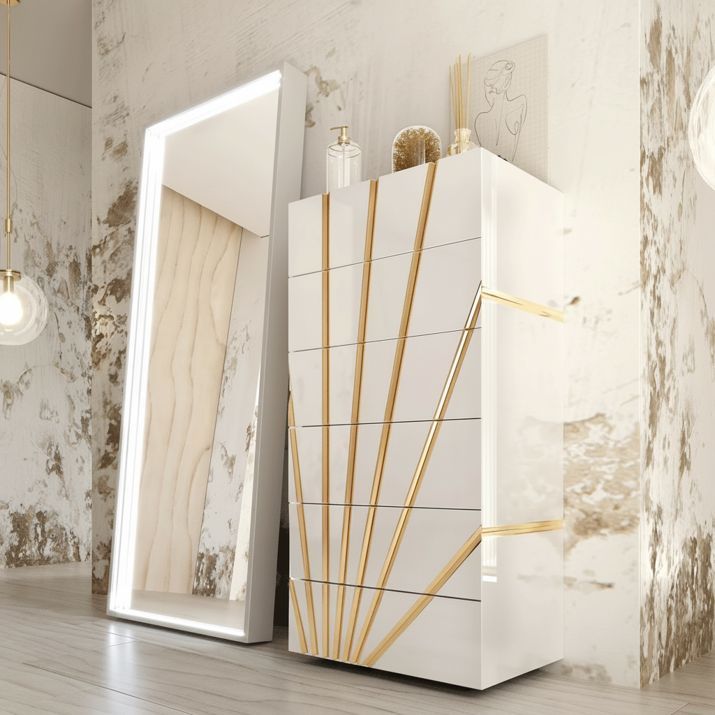 Experience the pinnacle of style and functionality with this coordinated collection that balances avant-garde trends with practical needs. Whether you are looking to refresh your home or create a gallery of modern style, the Oro White Bedroom Comp 2 offers a unique aesthetic that harmonizes perfectly with refined interiors. Its luxurious finishes and striking gold-line design ensure that your bedroom remains a centerpiece of glamour and sophistication.