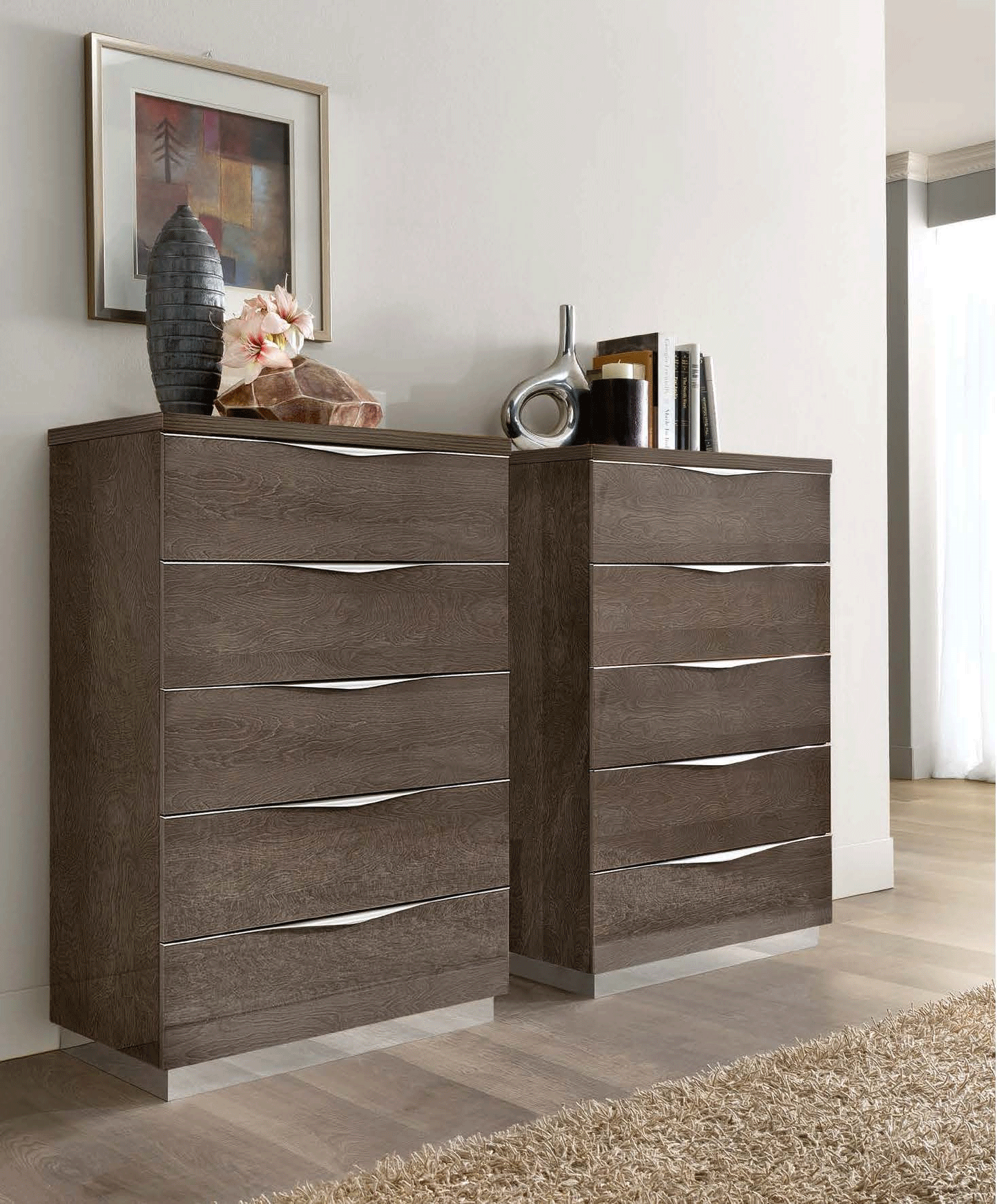 With a rich wood-grain appearance that adds warmth to its sleek profile, this chest is as functional as it is beautiful. Multiple spacious drawers provide organized storage for your wardrobe essentials, while the subtle integrated metal pulls maintain the clean, minimalist lines favored in modern interiors. This sophisticated furniture piece seamlessly blends artistic flair with practical utility, making it an ideal choice for those who appreciate the pinnacle of European craftsmanship and high-end design.